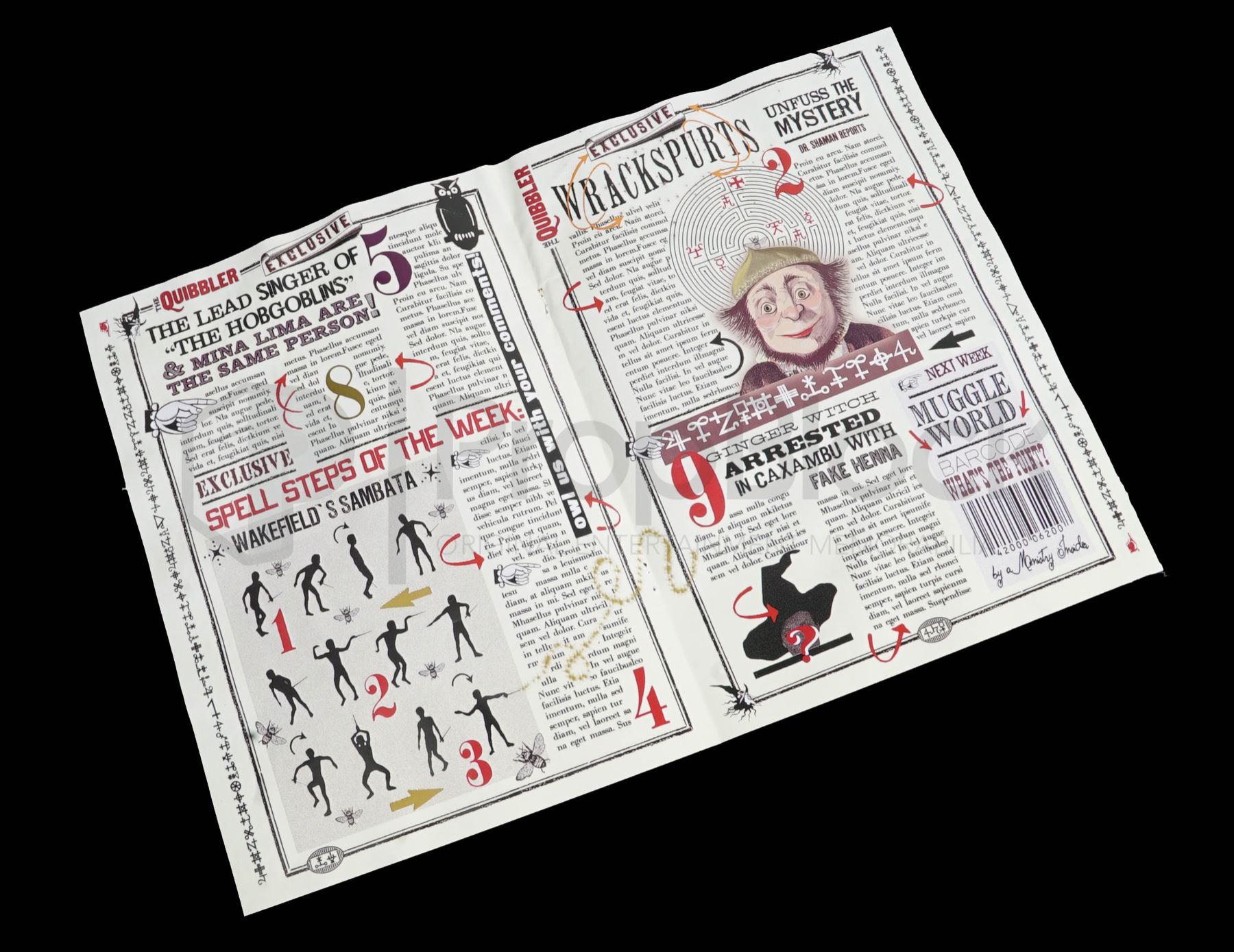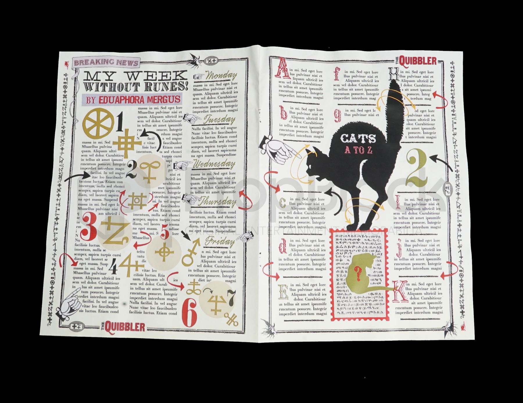 Original color double-sided Quibbler page featured in the seventh Harry Potter film The Deathly Hallows: Part 1. Without the guidance and protection of their professors, Harry (Daniel Radcliffe), Ron (Rupert Grint) and Hermione (Emma Watson) begin a mission to destroy the Horcruxes, the sources of Voldemort’s immortality. This page can be seen in the printing press and laying around the Lovegood house where the magazine was published. Printed on both sides of a piece of off white newspaper print paper. This item remains in excellent, production made condition.