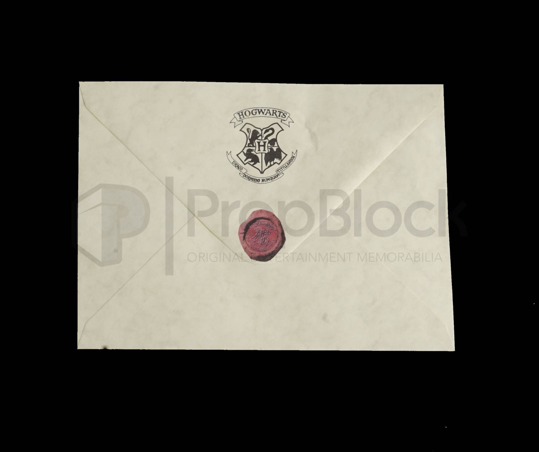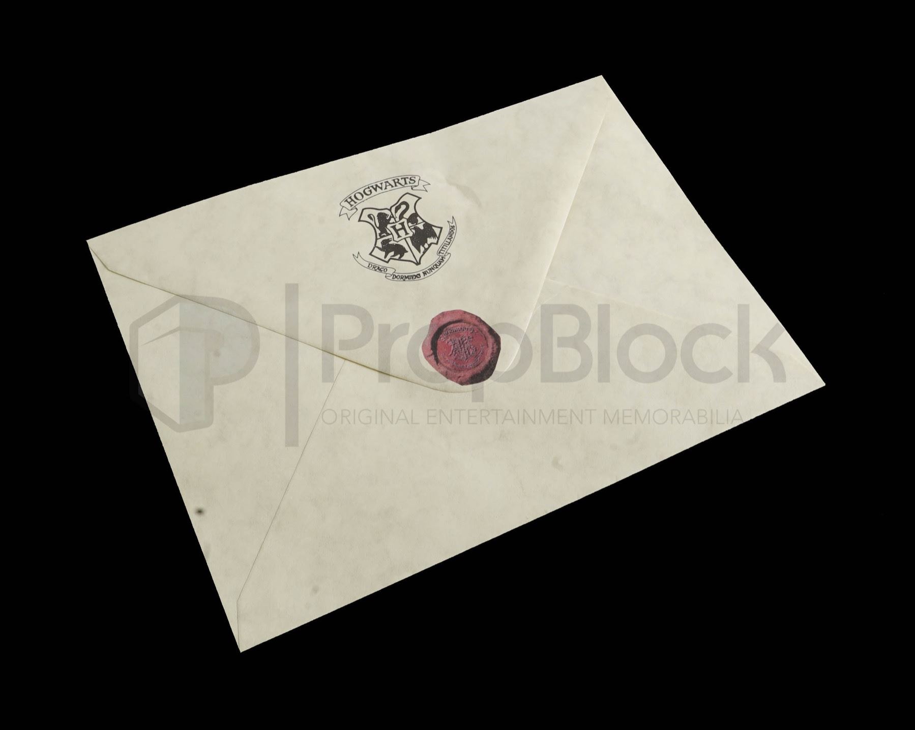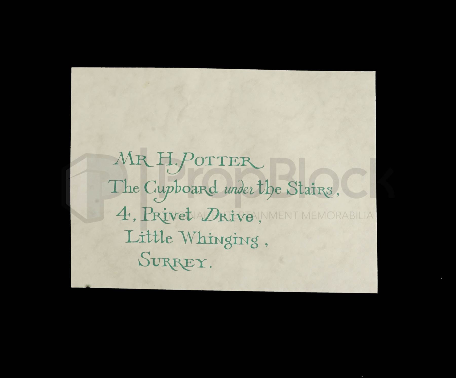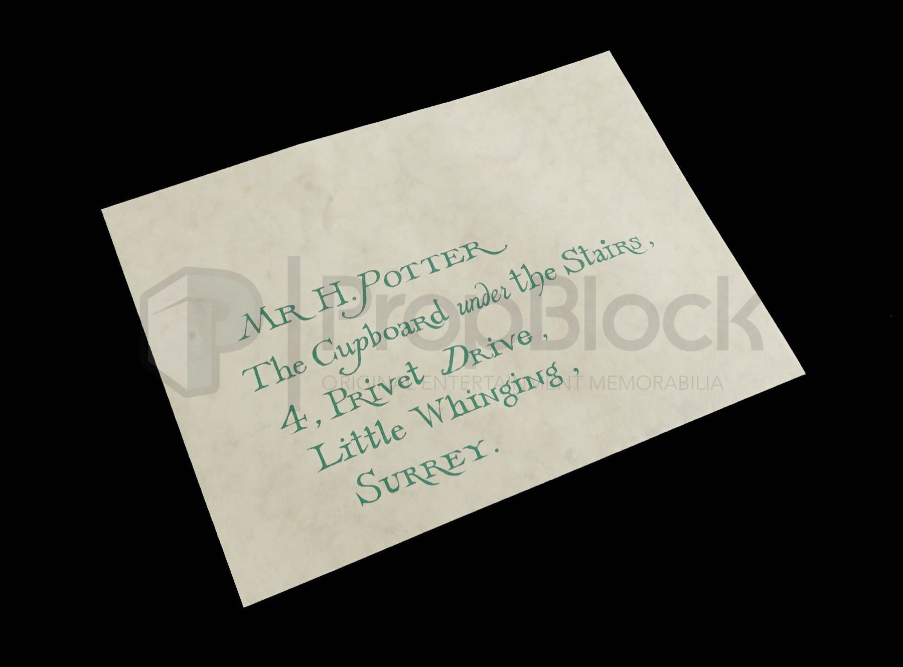 Original invitation letter used in the production of the 2001 film Harry Potter & the Sorcerer's Stone. An orphaned boy enrolls in a school of wizardry, where he learns the truth about himself, his family and the terrible evil that haunts the magical world. There were different styles of these letters used for filming, a hero version with a wax seal and this style version with a printed seal. These can be seen filling the house of the Dursleys. This off white envelope features green ink printed on the front with the Hogwarts seal on the back in black and red. This original piece remains in excellent, production used condition.
