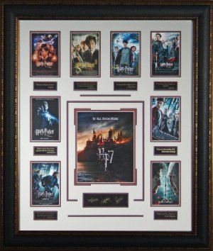 This 28x34 piece features the Laser Engraved Replica Signatures of Daniel Radcliffe (Harry Potter), Emma Watson (Hermione Granger), and Rupert Grint (Ron Weasley) from the Harry Potter Movie Series. The Harry Potter film series is a British-American film series based on the Harry Potter novels by the British author J. K. Rowling. The series is distributed by Warner Bros. and consists of eight fantasy films. It is the highest-grossing film series of all-time in inflation unadjusted dollars, with $7.7 billion in worldwide receipts. Each film is in the 35 highest-grossing films of all-time in inflation unadjusted dollars. This is Quality Leather Framed as shown with mini posters of all 8 Harry Potter movies and descriptive plaques with quotes to an approx. overall size of 28x34".