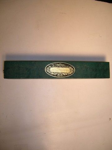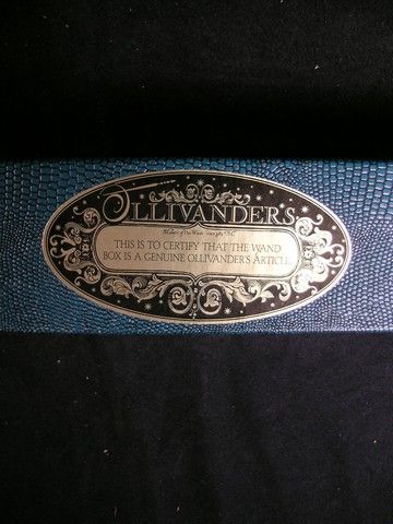 During filming, the wand boxes were prone to tipping over and the contents falling out, so sealed, empty boxes were substituted on the shelves for easier handling. The box is made using a green 'alligator skin' patterned cardboard, with an Ollivander's sticker affixed to the lid, and small metal clasp on one end. (measures approx. 14 1/4"x 3 1/2").