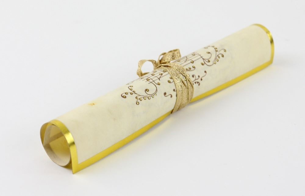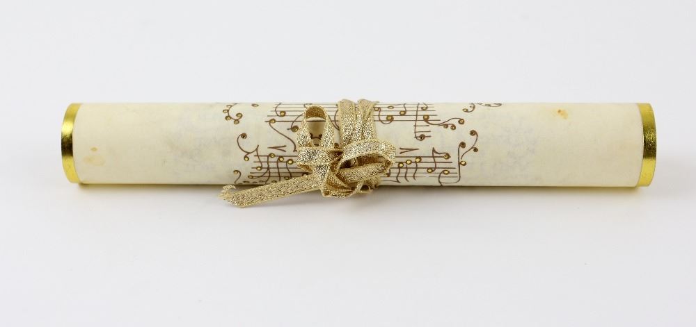 Harry Potter and The Philosophers Stone (2001) - An elaborate gold inlaid production made song sheet with gold ribbon tie used in the film by the students in the Great Hall at Hogwarts, 10 x 8.5 inches.Provenance: The vendor worked as a Transport driver on numerous films including Harry Potter..