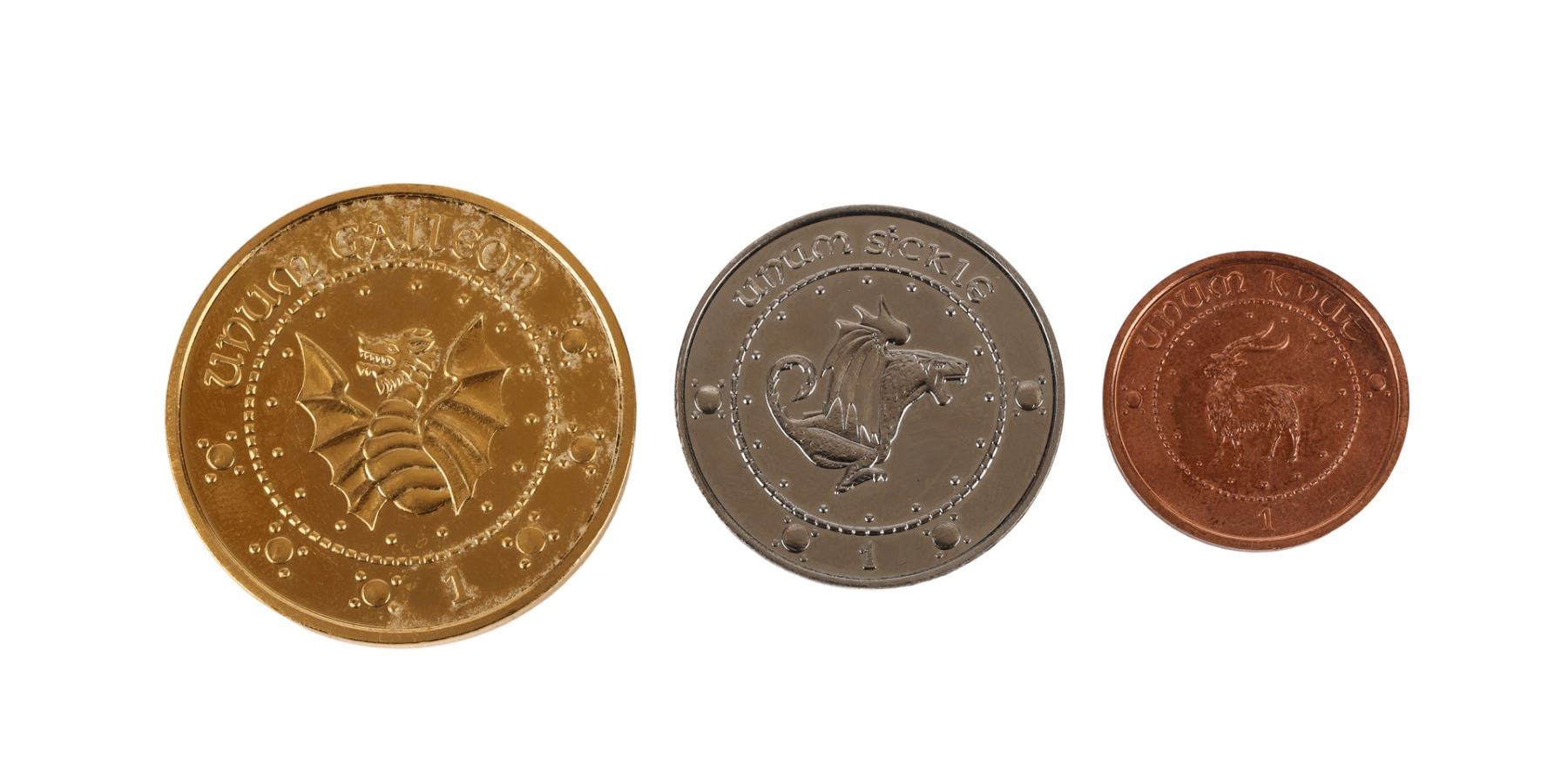 These signature coins can be seen throughout the Harry Potter franchise as one of the main currencies used in the Wizarding World. This set features three coins, the gold galleon, silver sickle, and bronze knut, each with the head of a wizard on the head side of each of the coins. The backs of the coins differ, with the 1 1/2-inch galleon bearing a raised image of a dragon with wings spread in flight, the 1 1/4-inch sickle bearing the raised image of a smaller dragon landing, and the 1-inch knut bearing an image of a goat. This set remains in excellent, production-used condition. This lot is accompanied by a Certificate of Authenticity from Studio Auctions.