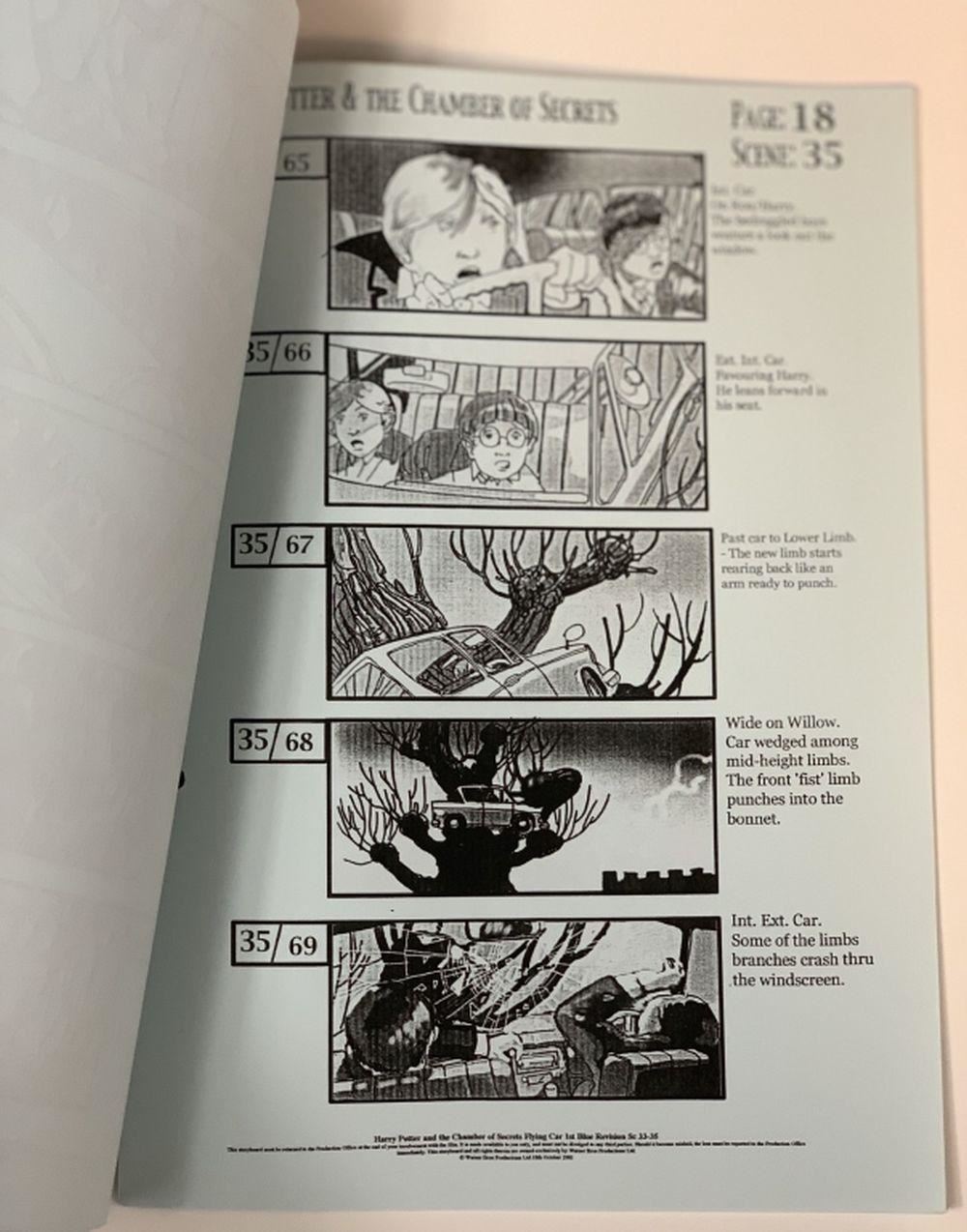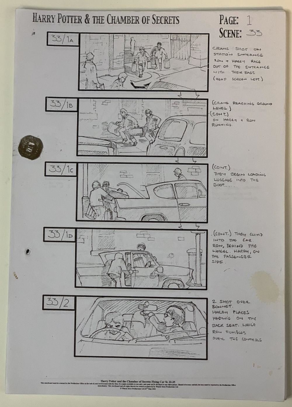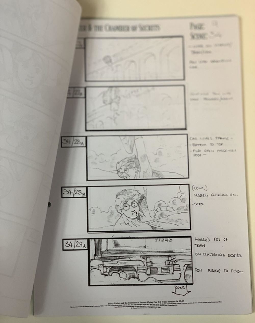 Original set of 30 pages of production used storyboards (Prints) used in the fantasy film Harry Potter and the Chamber of Secrets (2002), directed by Chris Columbus, where an ancient prophecy seems to be coming true when a mysterious presence begins stalking the corridors of a school of magic and leaving its victims paralyzed.