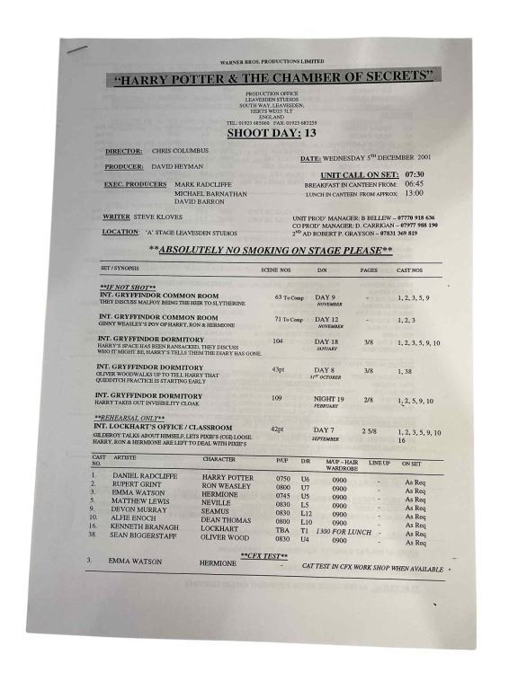 Harry Potter and the Chamber of Secrets (2002) - Call Sheet.