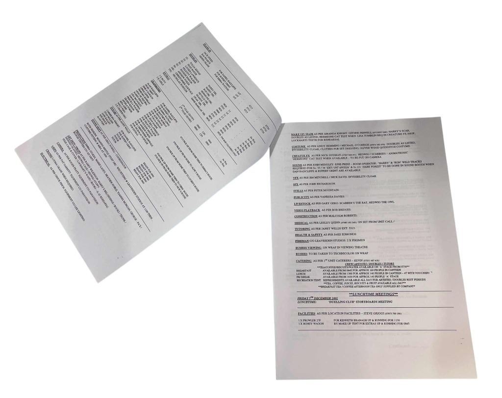 Original call sheet used in the production of the Chris Columbus directed fantasy film 'Harry Potter and the Chamber of Secrets' (2002), where an ancient prophecy seems to be coming true when a mysterious presence begins stalking the corridors of a school of magic and leaving its victims paralyzed.