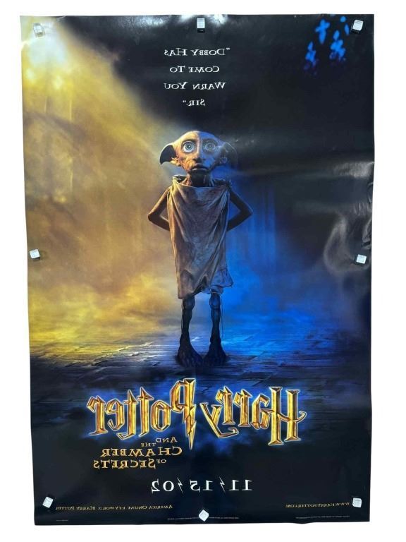 Original double sided theater teaser poster from the production of the Chris Columbus directed fantasy film 'Harry Potter and the Chamber of Secrets' (2002), where an ancient prophecy seems to be coming true when a mysterious presence begins stalking the corridors of a school of magic and leaving its victims paralyzed.