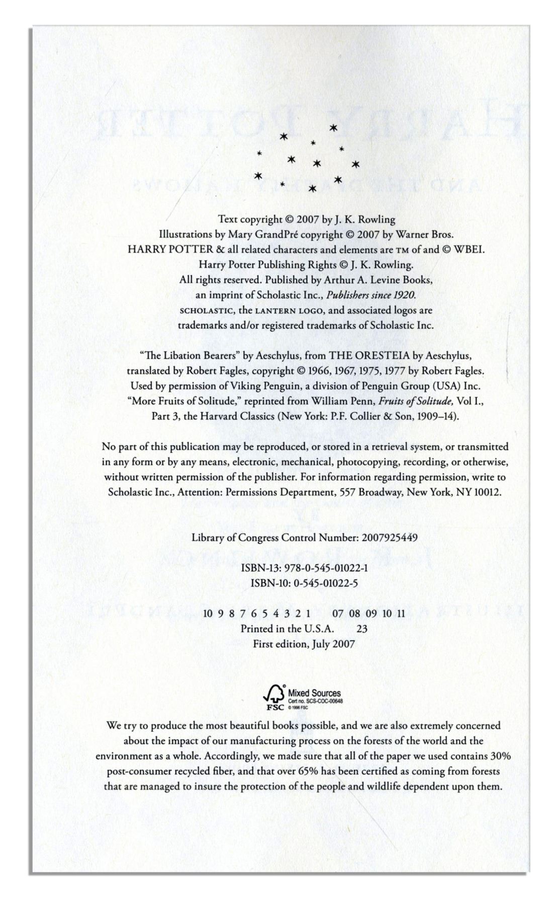 First American edition, first printing of J.K. Rowling's ''Harry Potter and the Deathly Hallows''. New York: Scholastic Press: 2007. In this seventh and final book in the series, Harry Potter confronts his nemesis, Lord Voldemort. The stated first edition, with original unclipped dust jacket, measures 6.25'' x 9.25'' and runs 759pp. Near fine condition.