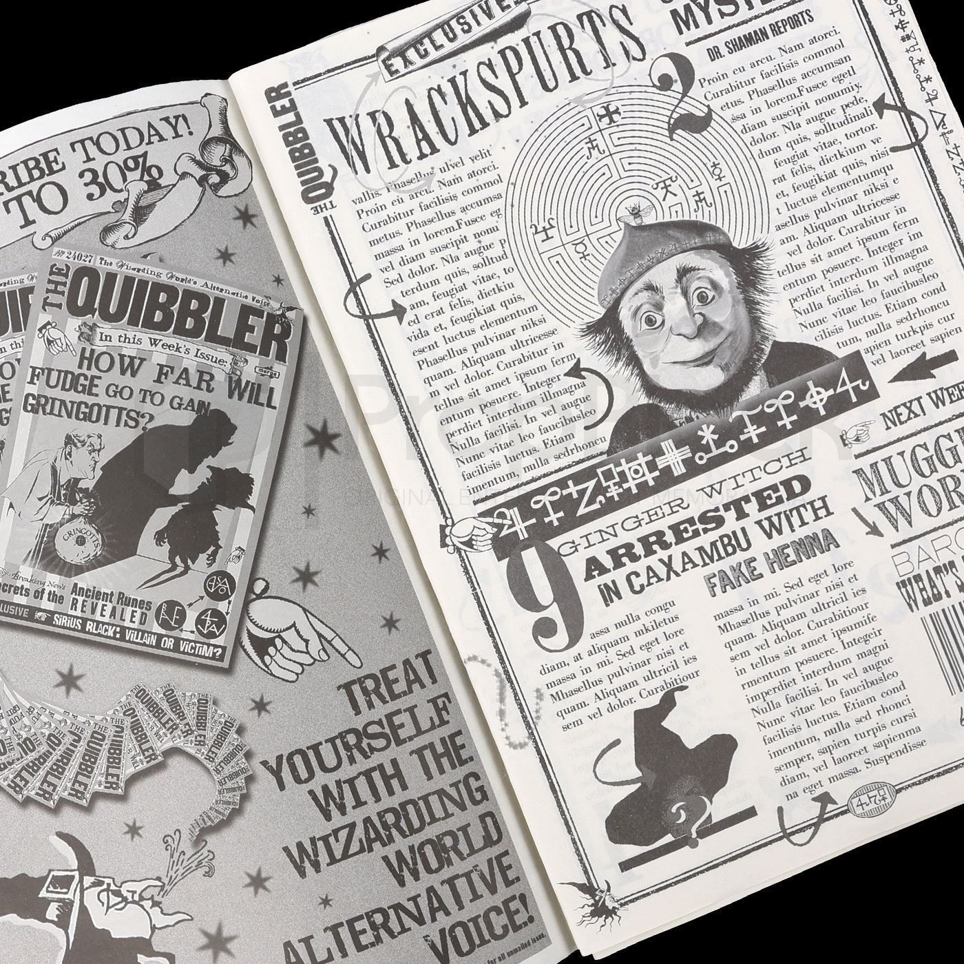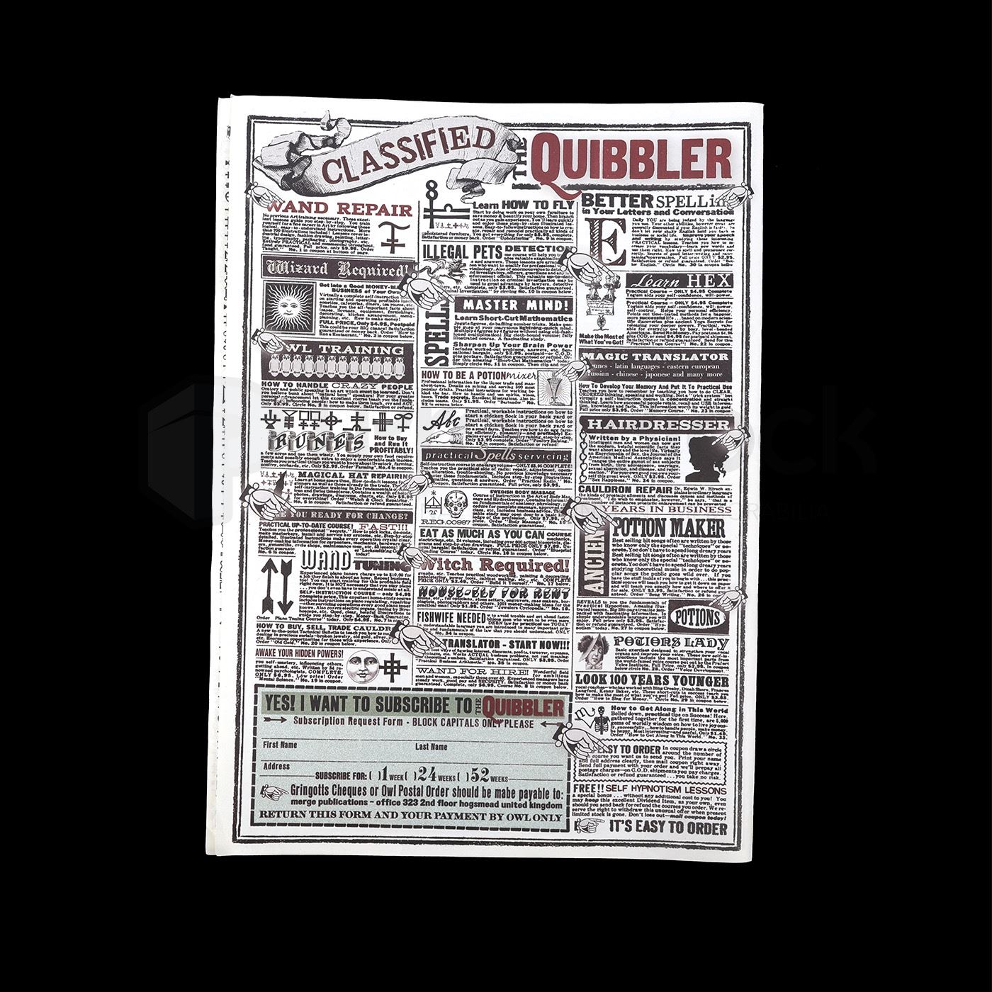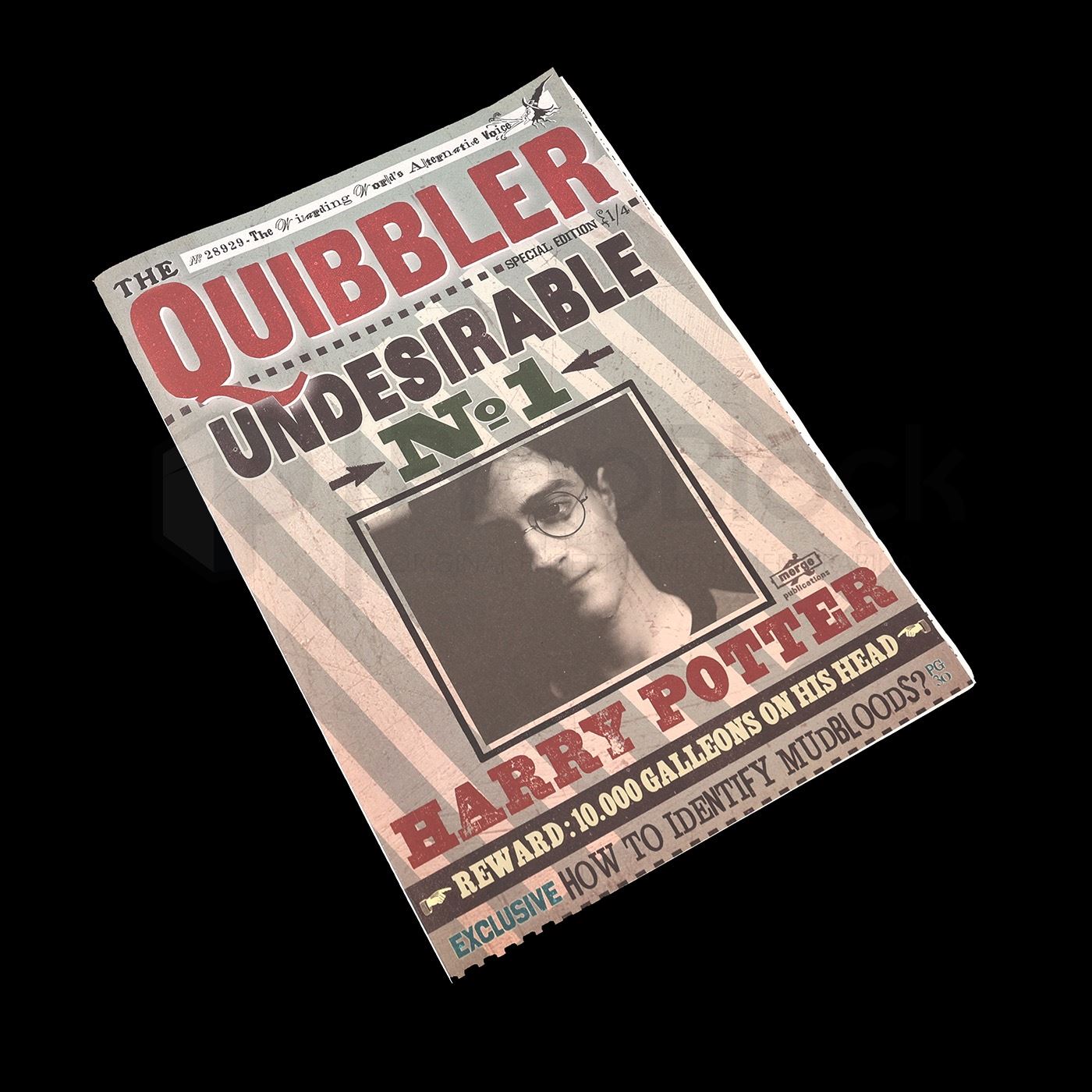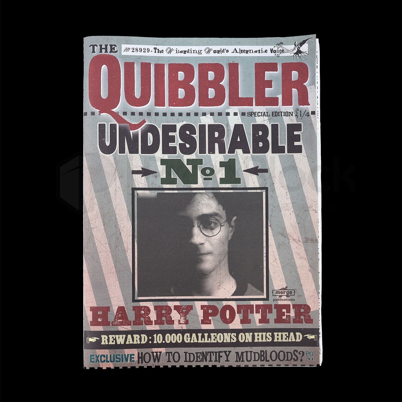 An issue of The Quibbler magazine produced for Harry Potter and The Deathly Hallows: Part 1 (Warner Bros., 2010) featuring a picture of Potter on the cover as “Undesirable No. 1,” along with other in-universe headlines. Advertising copy on the back is also fully realized, in-universe text. Published in-universe by Xenophilius Lovegood, father of Harry Potter’s classmate Luna, The Quibbler bills itself as the wizarding world’s alternative voice, and is distributed by Merge Publications, located in the fictional village of Hogsmeade. Merge Publications’ logo design is a take on that of graphic artist team MinaLima, which designed hundreds of props for the Harry Potter films, including issues of The Quibbler matching this “Undesirable No. 1” cover. The “Undesirable” issues were printed for Harry Potter and the Deathly Hallows: Part 1, but they do not appear in the final cut of the film.