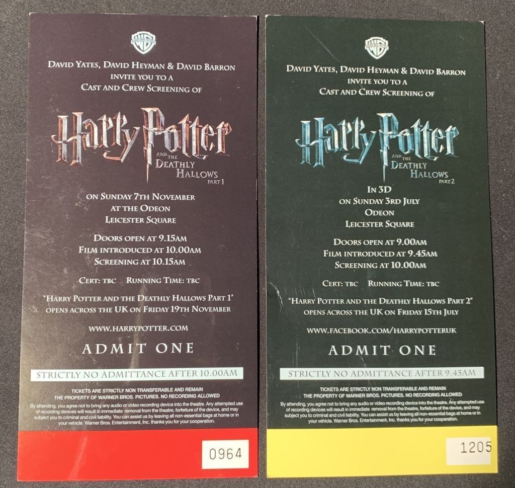 Harry Potter and the Deathly Hallows: Part 1 & 2 (2010-2011) - Pair of Cast and Crew Tickets For Part 1 and 2.