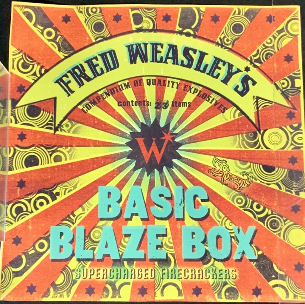 Original Fred Weasley blaze box label from the Harry Potter fantasy film Harry Potter and the Deathly Hallows: Part 1 (2010) based on the Harry Potter novels by author J. K. Rowling.