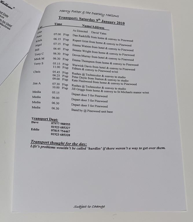 Original production used call-sheet from the fantasy film 'Harry Potter and the Deathly Hallows: Part 2' (2011), where, Harry, Ron, and Hermione search for Voldemort's remaining Horcruxes in their effort to destroy the Dark Lord as the final battle rages on at Hogwarts.