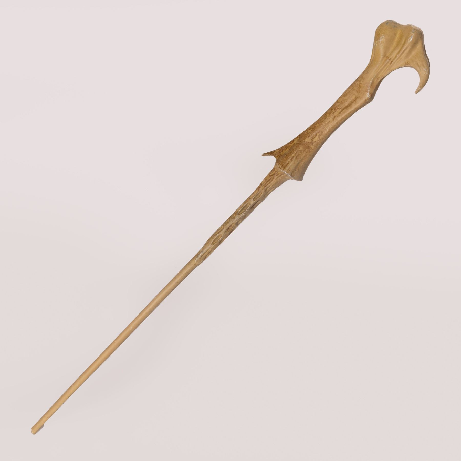 Lord Voldemort, the antagonist of the Harry Potter series, uses this type of wand in the Goblet of Fire once his full power is restored by his henchman Peter Pettigrew (Timothy Spall). This wand is made of cast resin and has been painted to resemble bone, with hues of white and yellow. The wand features a smooth, thin round shaft with a handle section made to resemble a large claw. This piece shows signs of wear from use but remains in excellent, production-used condition. This lot is accompanied by a Certificate of Authenticity from Studio Auctions.