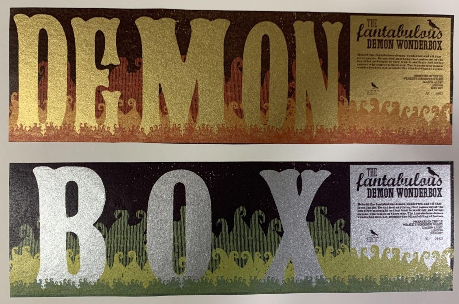Original production made set of 2 "Demon Box" store labels from "Weasleys' Wizard Wheezes" store from the fantasy film "Harry Potter and the Half-Blood Prince" (2009), directed by David Yates. The story follows Harry Potter's sixth year at Hogwarts as he receives a mysterious textbook, falls in love, and attempts to retrieve a memory that holds the key to Lord Voldemort's downfall.