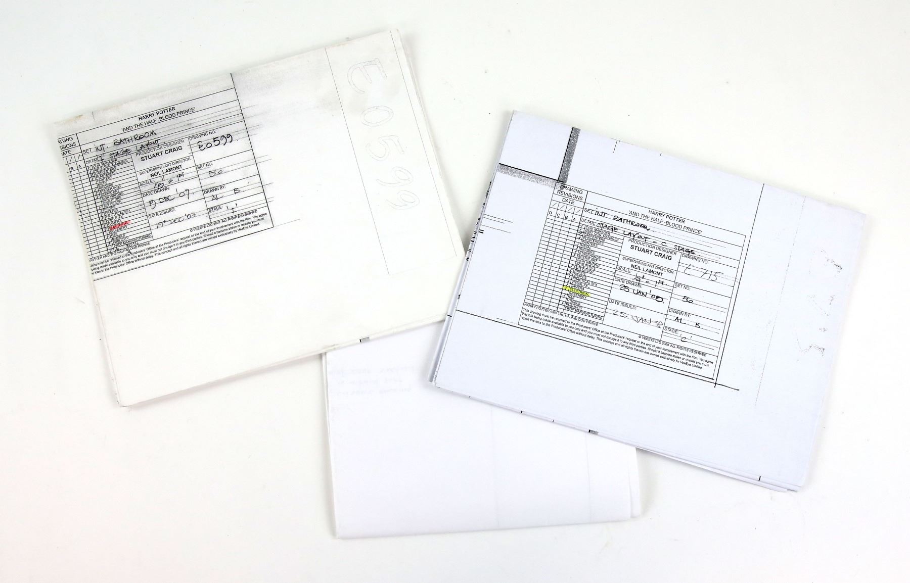 Harry Potter and the Half Blood Prince - Three original copies of set designs for the stage layout of the Int bathroom. Made for the electrical department (3).Provenance: With certificate of authenticity.