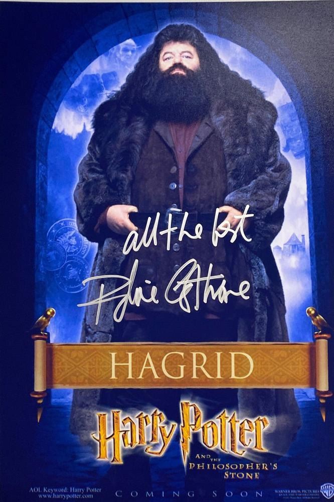 Harry Potter and the Philosopher's Stone facsimile signed movie photo autographed by Robbie Coltrane. 8x10 inches. This item is a reprint of an original autograph