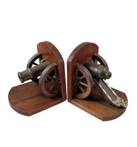 Well-crafted wood bookends with a decorative metal cannon used in the production of Harry Potter and the Prisoner of Azkaban (2004), whereby Harry Potter (Daniel Radcliffe) learns new defense arts magic and his family's secret tie to notorious convict Sirius Black. Each bookend measures approx. 8" x 9".