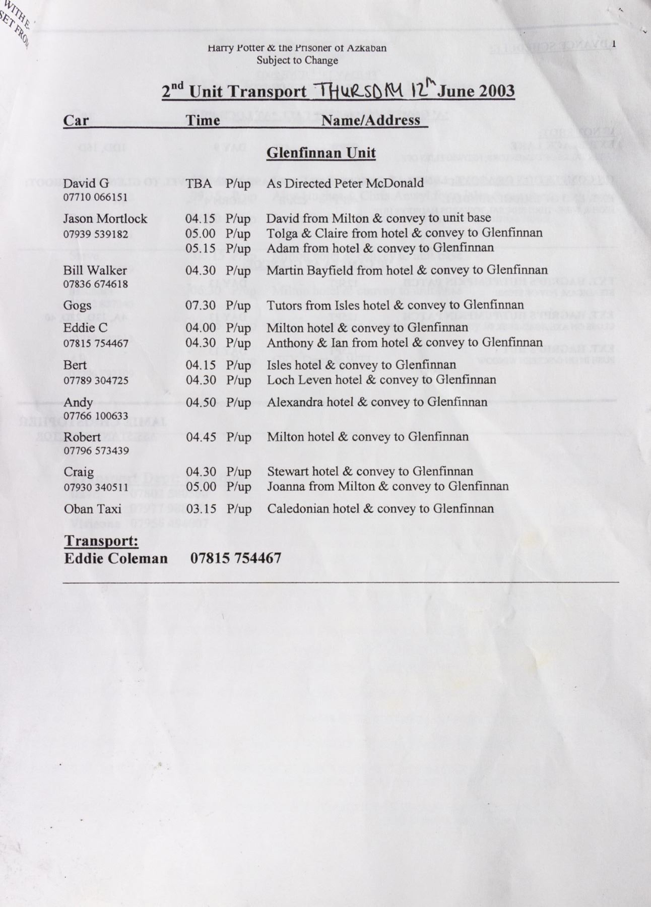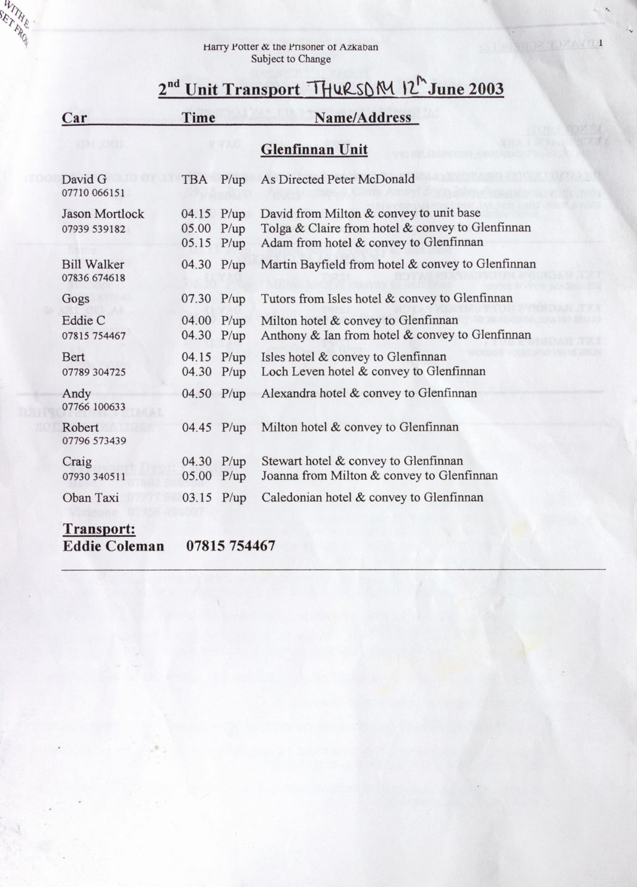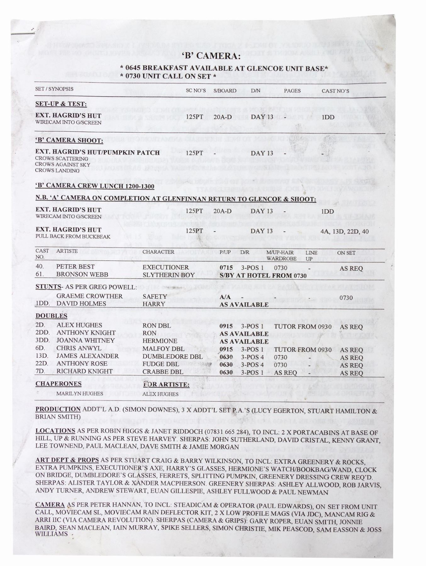 (Warner Bros., 2003) A production call sheet used in the creation of Harry Potter and the Prisoner of Azkaban. The Prisoner of Azkaban is the 3rd film in the Harry Potter series, and call sheets such as this are used to designate the rolls of the crew members during production for that day. This call sheet is dated for the 12th and 13th of June, 2003, and lists the location and instructions involved with shooting for those two days. The sheet measures 11.75"x8.25" and is in good condition overall with minor wear, including some discoloration to the first and last pages.