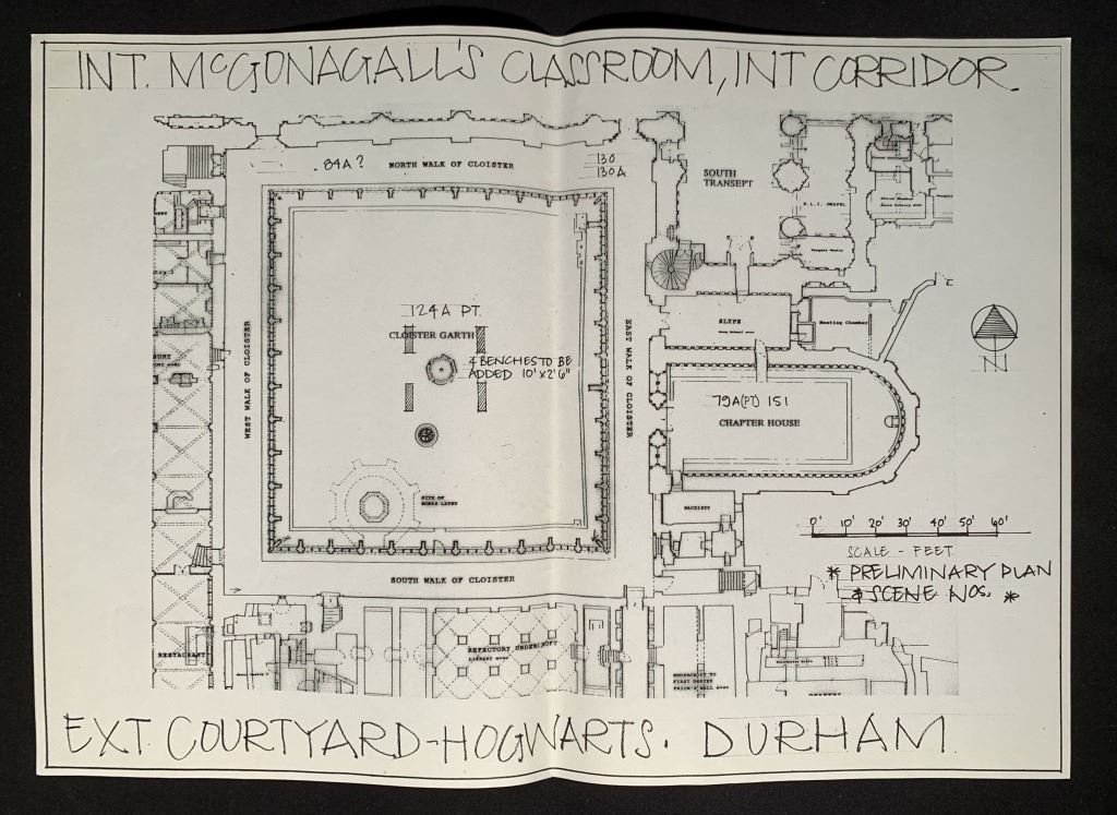 Original exterior layout for the 'Hogwarts Courtyard' used in the production of the fantasy film 'Harry Potter and the Sorcerer's Stone' (2001), directed by Chris Columbus, where an orphaned boy enrolls in a school of wizardry, where he learns the truth about himself, his family and the terrible evil that haunts the magical world.