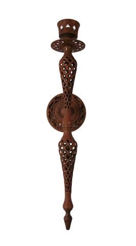 Special-effects rusted candleholder affixed to the wall of the Diagon Alley set during the filming of Harry Potter and the Sorcerer's Stone (2001). As this video shows, the fantastical Diagon Alley set has been recreated as a theme park attraction at Universal Studios in Orlando: https://www.youtube.com/watch?v=3p_ygTw4reA. Made of metal. Approx. 19" x 6 1/2".