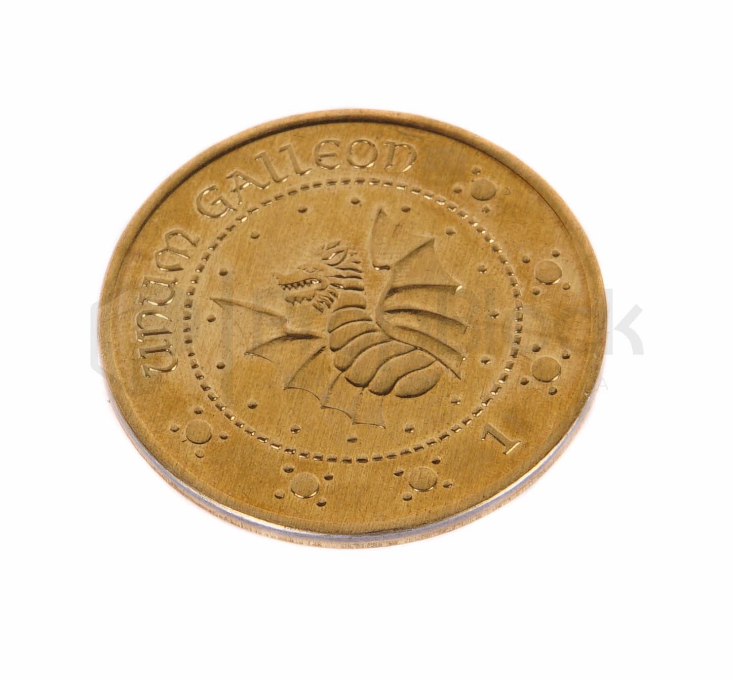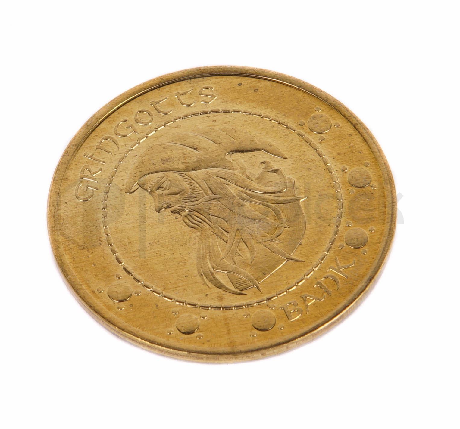 Early version of gold Galleon featured in Harry Potter and the Sorcerer's Stone. Gringotts is the bank for the wizarding world in England where the film takes place, and this was one of the main currencies of the film. This version is made of metal and features the same detailing as the later coins but is thinner in appearance. This piece remains in excellent, production made condition.