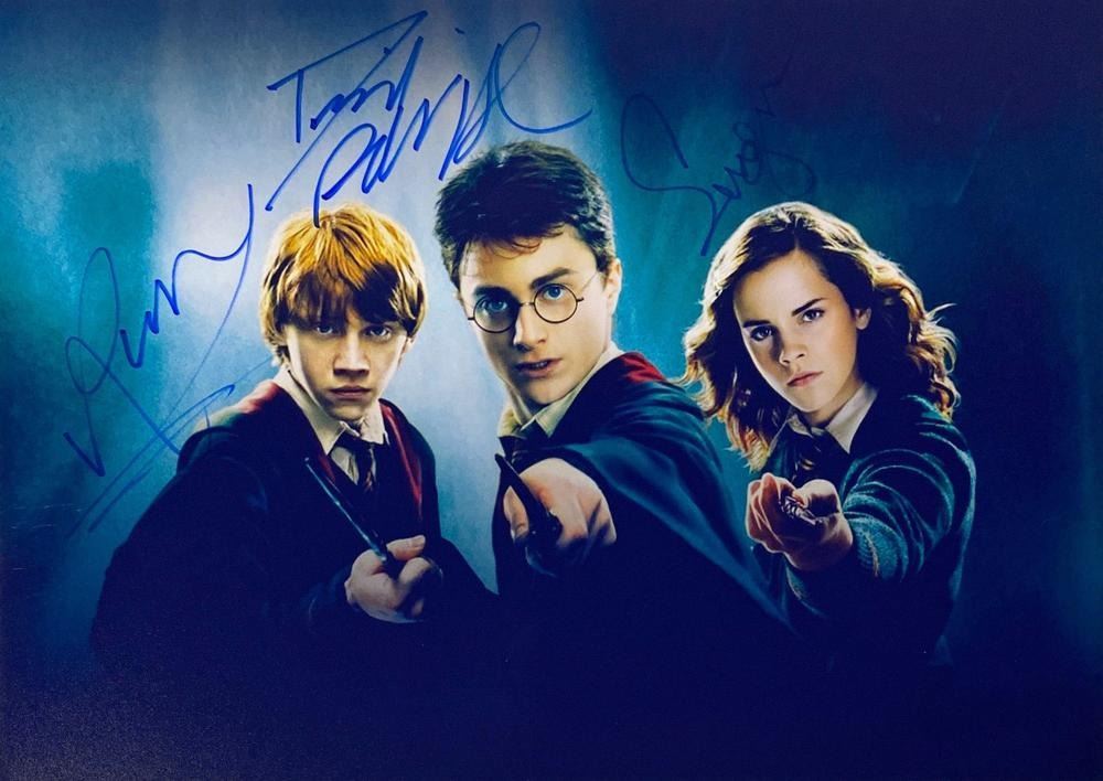 Harry Potter cast facsimile signed movie photo autographed by Rupert Grint, Daniel Radcliffe and Emma Watson. 8x10 inches. This item is a reprint of an original autograph