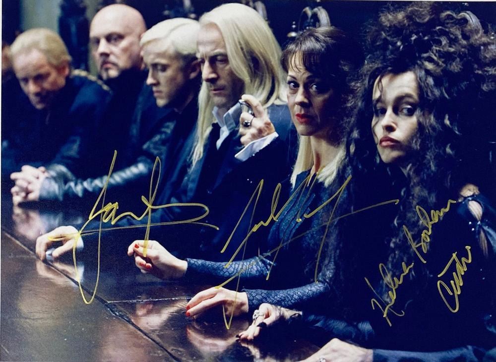 Harry Potter cast facsimile signed movie photo autographed by Jason Isaacs, Helen McCrory and Helena Bonham Carter. 8x10 inches. This item is a reprint of an original autograph