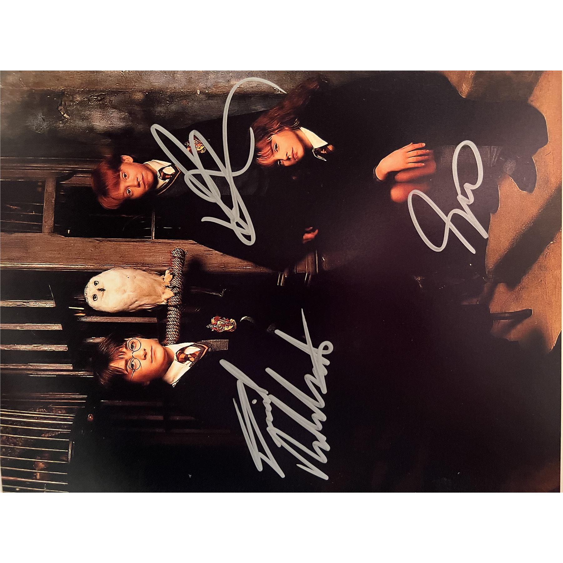 Harry Potter cast signed movie photo autographed by Daniel Radcliffe, Emma Watson and Rupert Grint. 8x10 inches