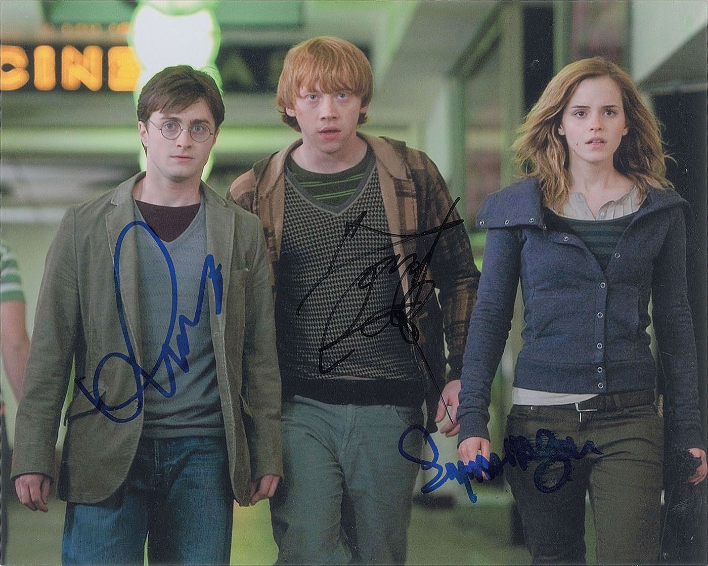 Color satin-finish 10 x 8 photo of Harry Potter, Ron Weasley, and Hermione Granger walking with concerned expressions, signed in blue felt tip by Daniel Radcliffe, Rupert Grint, and Emma Watson. In fine condition, with smudging to Watson's last name.