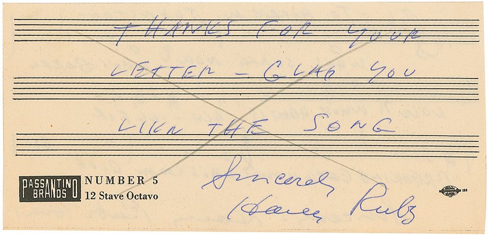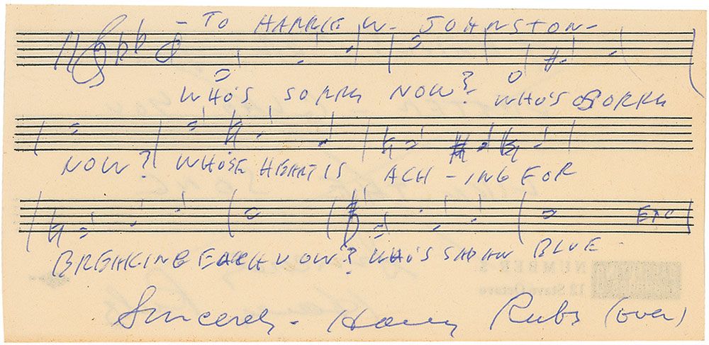 Prolific American songwriter (1895–1974) whose works, many of which were prominently featured in the films of the Marx Brothers and Eddie Cantor, include such standards as ‘I Wanna Be Loved by You’ and ‘Three Little Words.’ AMQS on an off-white 6.25 x 3 sheet of music paper. Ruby pens 12 bars of music and lyrics to ‘Who’s Sorry Now,’ inscribing at the top, “To Harry W. Johnston,” adding on the reverse “Thanks for your letter—Glad you like the song. Sincerely, Harry Ruby.” Pencil lines through note on reverse and a uniform shade of mild toning, otherwise fine condition.