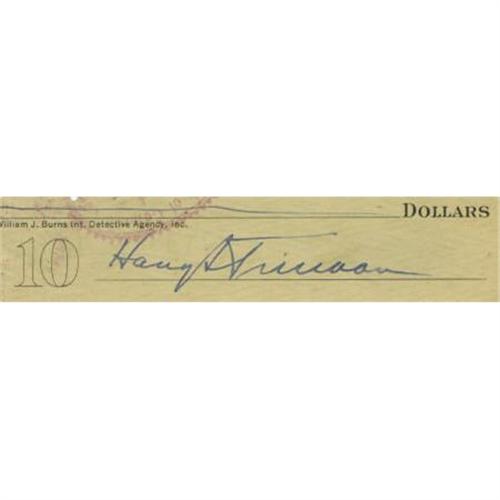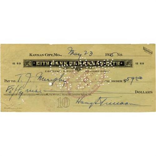 <B>Harry S. Truman 1925 Check Signed.</B></I> Document is 6.25" x 2.75", partly printed and filled out in Truman's handwriting, dated May 23, 1925, on the City Bank of Kansas City, payable to T. J. Murphy for $59.00. This check was written during the time that Truman held his first elective office. He was a judge of the County Court of the eastern district of Jackson County, Missouri, an administrative position that he would lose in a bid for re-election later in 1924. One vertical fold, punch and rubber stamp cancellations with the stamp just barely touching the "H" in the signature, a tear on the lower left with a tape repair on verso. Otherwise very good condition. A numbered PSA/DNA Certificate of Authenticity is included.<BR><BR><b>Shipping:</b> Flat Material, Small (<a target="_blank" href="http://www.heritageauctions.com/common/shipping.php">view shipping information</a>)