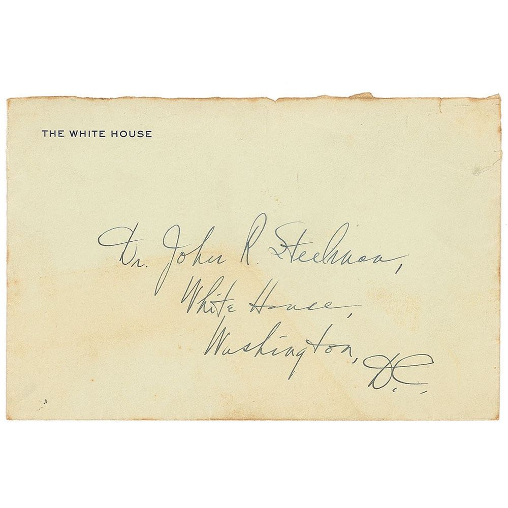ALS as president, one page, 7 x 8.75, White House letterhead, May 9, 1948. Handwritten letter to John R. Steelman, his chief of staff, in full: "Your birthday note was read with appreciation and much satisfaction. You were very kind to me. The communication from you made the 64th birthday much happier. My able staff, represented by you makes my job possible; and I'd say that to each of them too." In fine condition, with trivial stains along the extreme bottom edge. Accompanied by the original mailing envelope addressed in Truman's hand. Steelman's official title was 'The Assistant to the President of the United States,' a position now known as 'White House Chief of Staff'—the president's most trusted and important advisor. A fantastic association piece.
