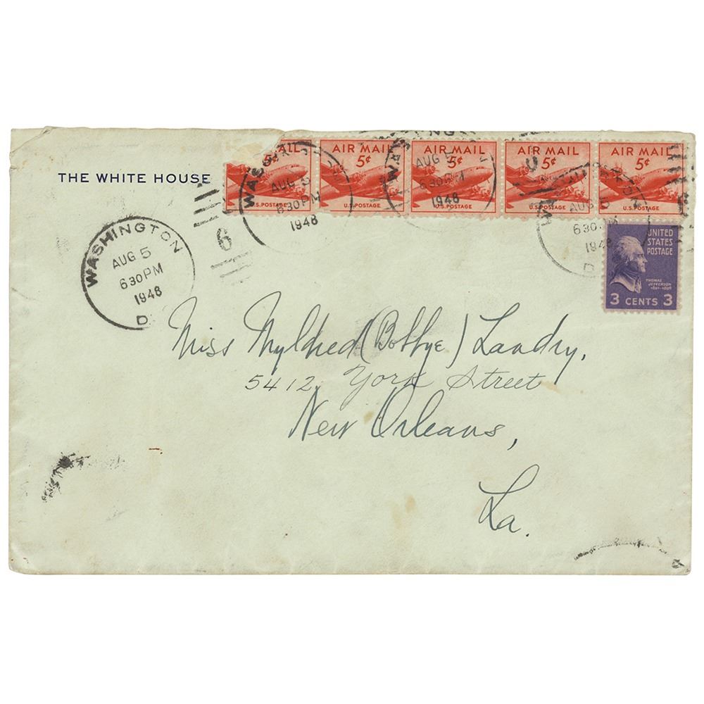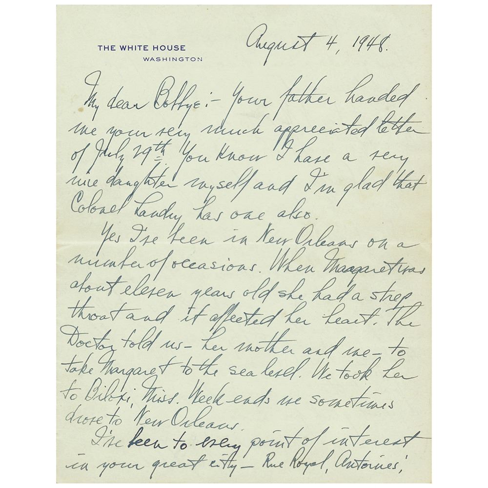 Fantastic ALS as president, three pages on two adjoining sheets, 7 x 8.75, White House letterhead, August 4, 1948. Handwritten letter to Myldred (Bobbye) Landry in New Orleans, the daughter of Robert B. Landry, USAF aide to President Truman. In full: "Your father handed me your very much appreciated letter of July 29ths. You know I have a very nice daughter myself and I'm glad that Colonel Landry has one also. Yes I've been in New Orleans on a number of occasions. When Margaret was about eleven years old she had a strep throat and it affected her heart. The Doctor told us—her mother and me—to take Margaret to sea level. We took her to Biloxi, Miss. Weekends we sometimes drove to New Orleans. I've been to every point of interest in your great city—Rue Royal, Antoine's, the Cabildo, the cemeteries, Jackson Park, the Mississippi River trip, etc.