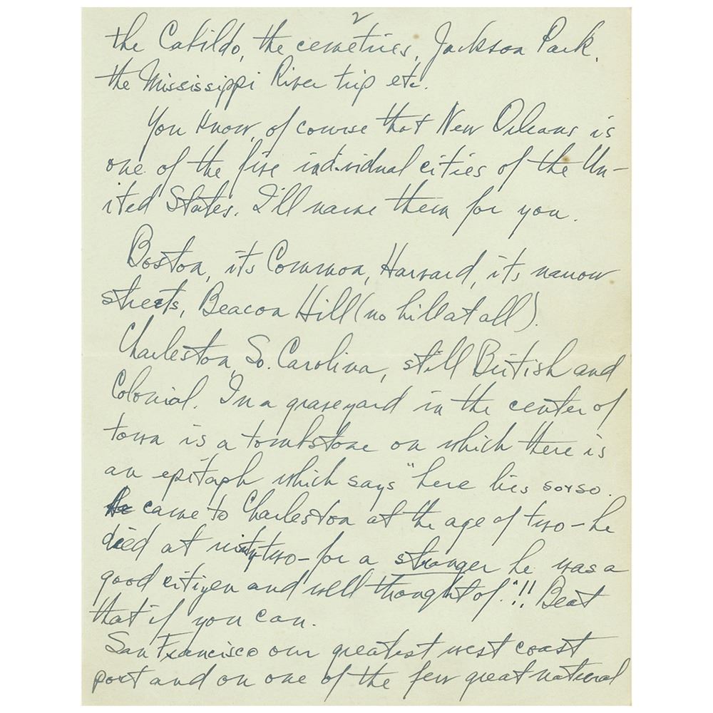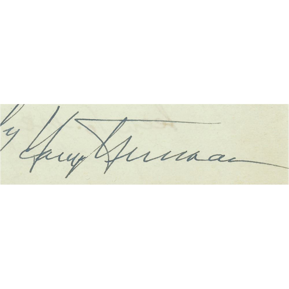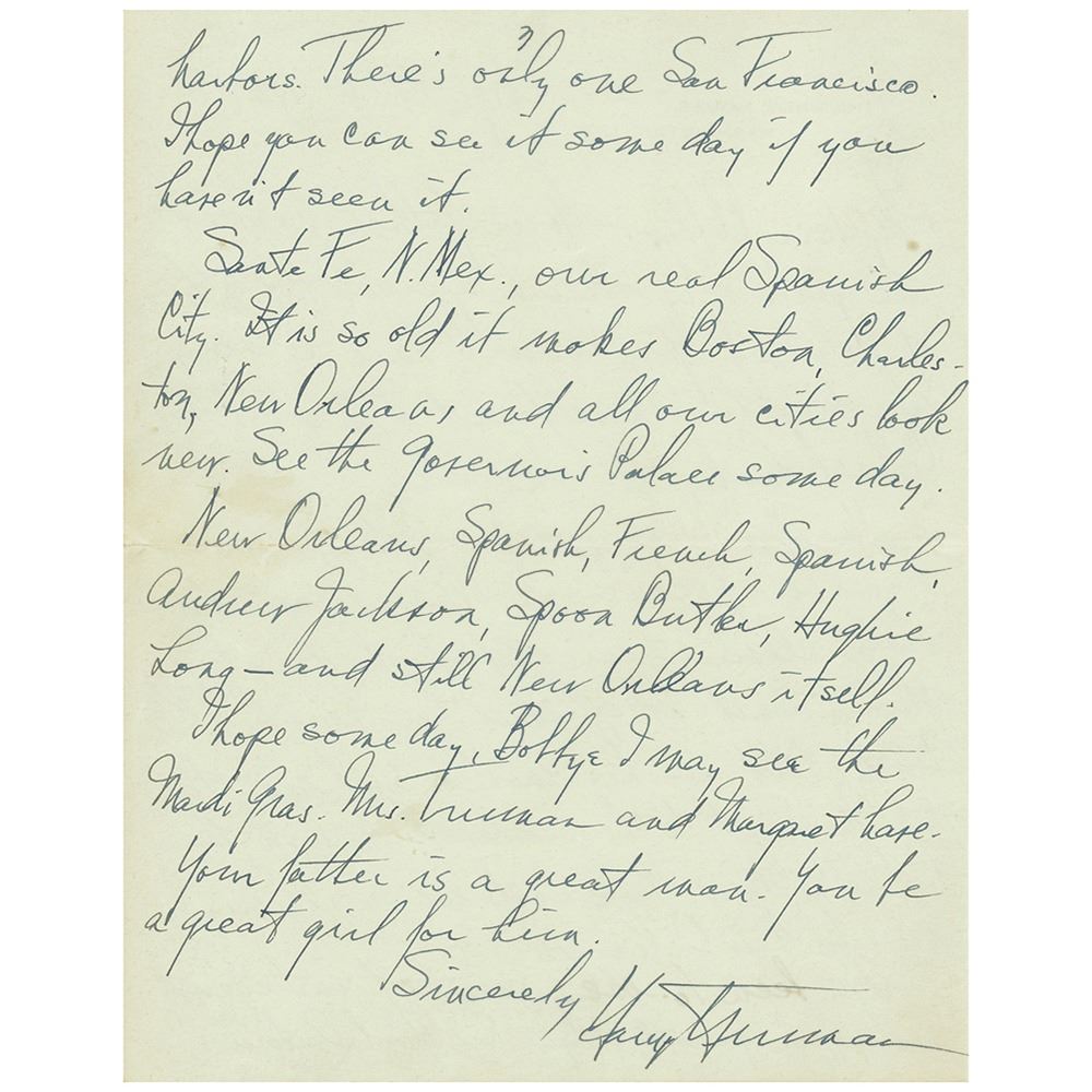 San Francisco our greatest west coast port and one of the few great natural harbors. There's only one San Francisco. I hope you can see it some day if you haven't seen it. Santa Fe, N. Mex., our real Spanish City. It is so old it makes Boston, Charlestown, New Orleans, and all our cities look new. See the Governor's Palace some day. New Orleans, Spanish, French, Spanish, Andrew Jackson, Spoon Butler, Hughie Long—and still New Orleans itself. I hope some day, Bobbye, I may see the Mardi Gras. Mrs. Truman and Margaret have. Your father is a great man. You be a great girl for him." In fine condition. Accompanied by the original White House mailing envelope, addressed in Truman's hand. A sought-after autograph letter signed as president, boasting excellent content on America's great cities.