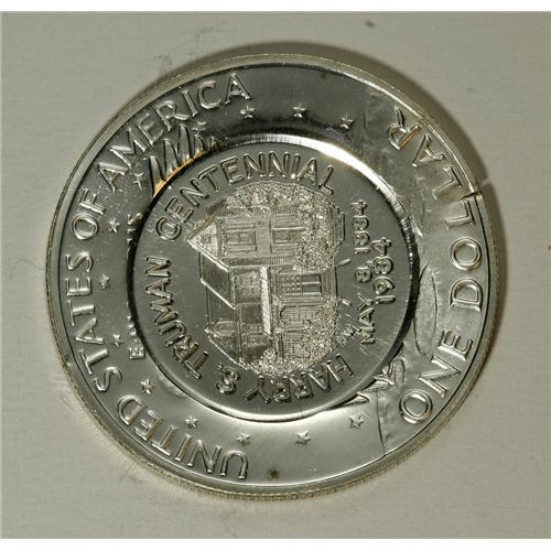 <B>Harry S. Truman Centennial Counterstamped on an Ike Dollar.</B></I> A neat item, a proof 1971-S Ike dollar that has been counterstamped for the Harry S. Truman Centennial and dated May 8, 1984. A certificate accompanies with the piece, stating only 1,000 examples were struck. The market value is approximately $50.<BR><BR><b>Shipping:</b> Coins & Currency (<a target="_blank" href="http://www.heritageauctions.com/common/shipping.php">view shipping information</a>)