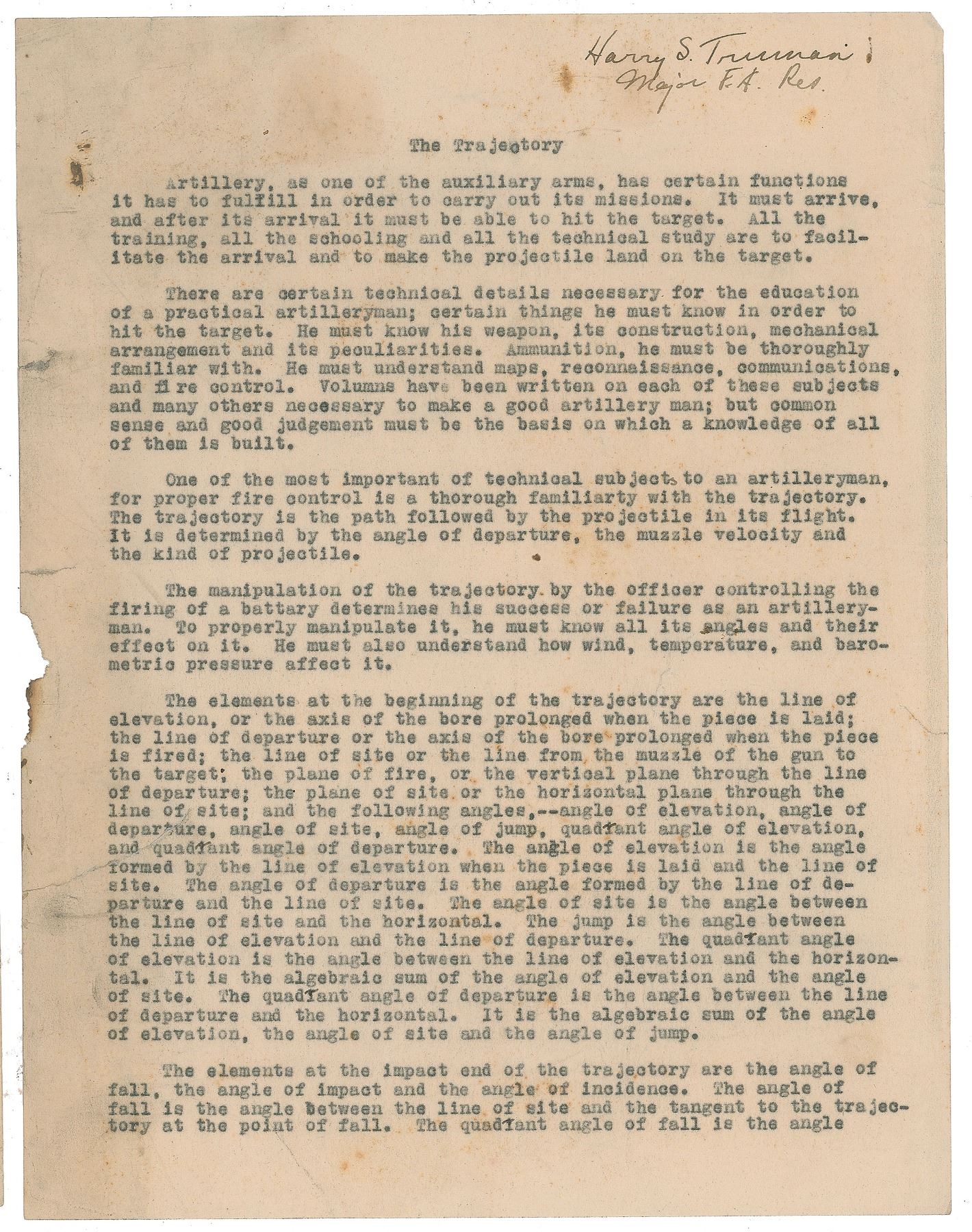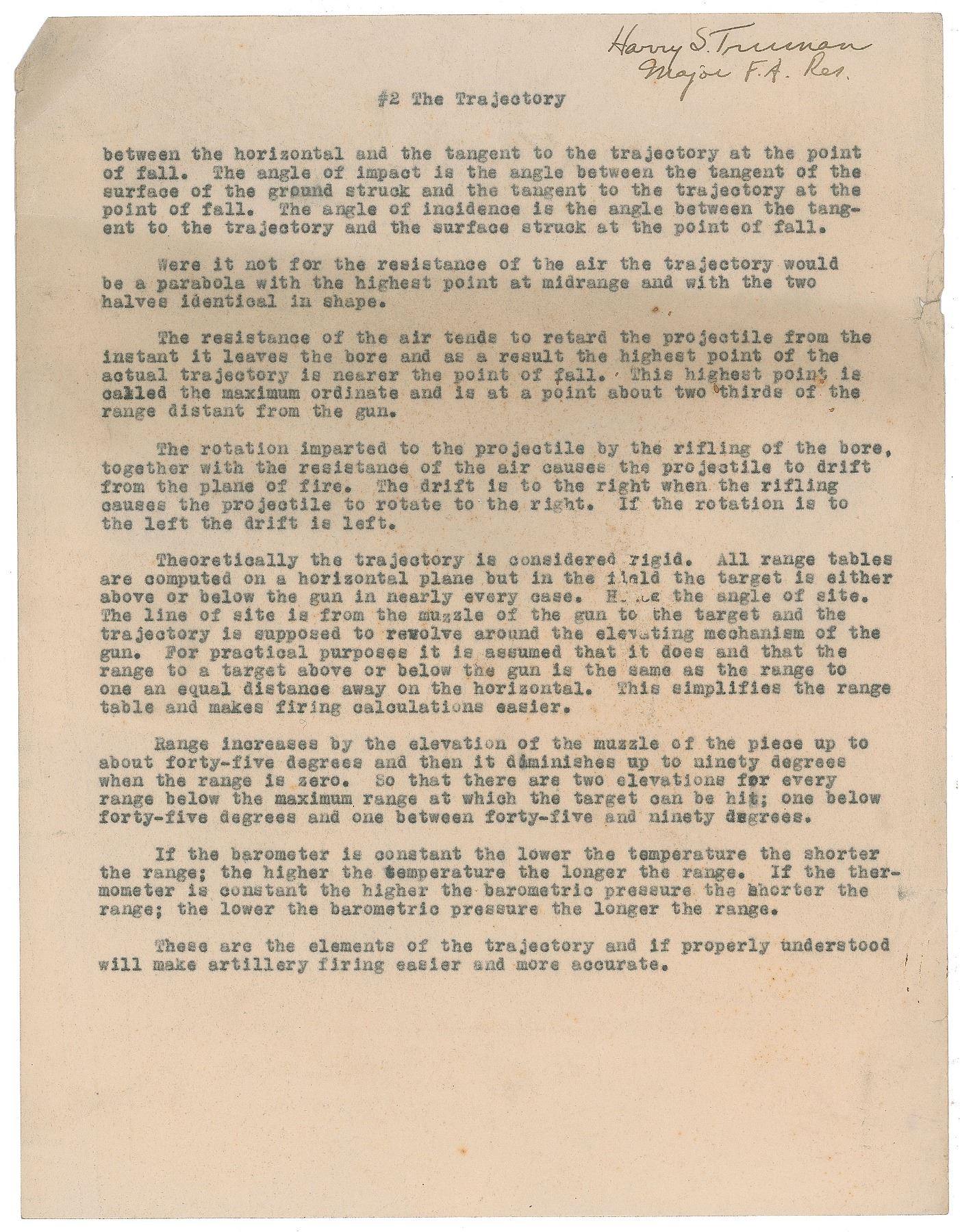 A two-page report entitled "The Trajectory," signed at the top of each page in ink, "Harry S. Truman, Major F. A. Res.," in part: "There are certain technical details necessary for the education of a practical artilleryman; certain things he must know in order to hit the target. He must know his weapon, its construction, mechanical arrangement and its peculiarities. Ammunition, he must be thoroughly familiar with. He must understand maps, reconnaissance, communications, and fire control…One of the most important technical subjects to an artilleryman, for proper fire control is a thorough familiarity with the trajectory. The trajectory is the path followed by the projectile in its flight." He goes on to discuss the technical aspects of the trajectory of ammunition.