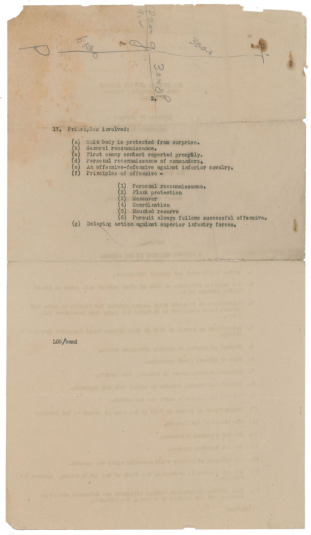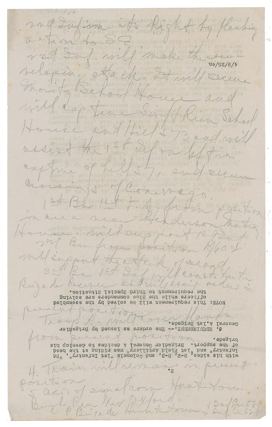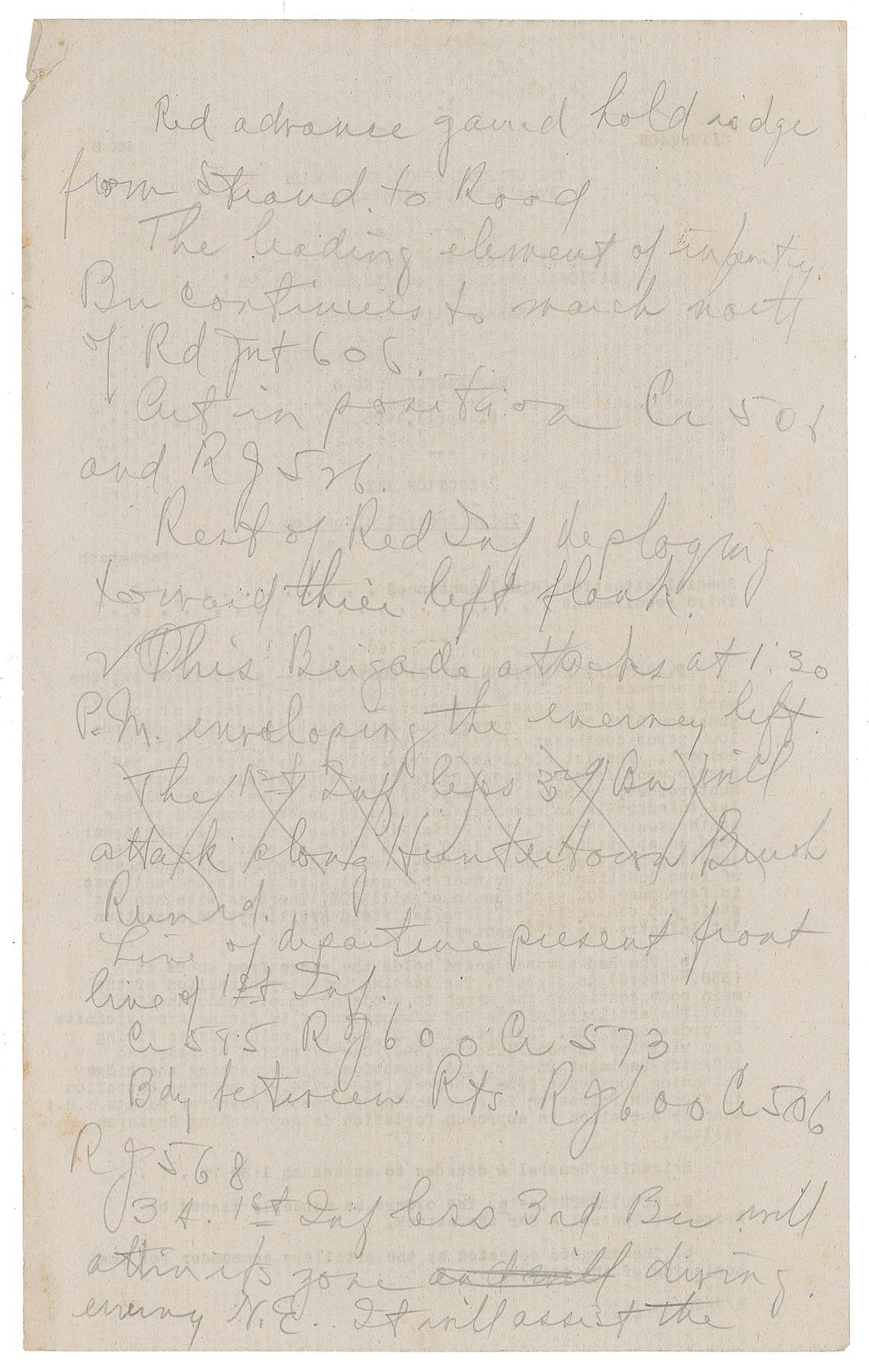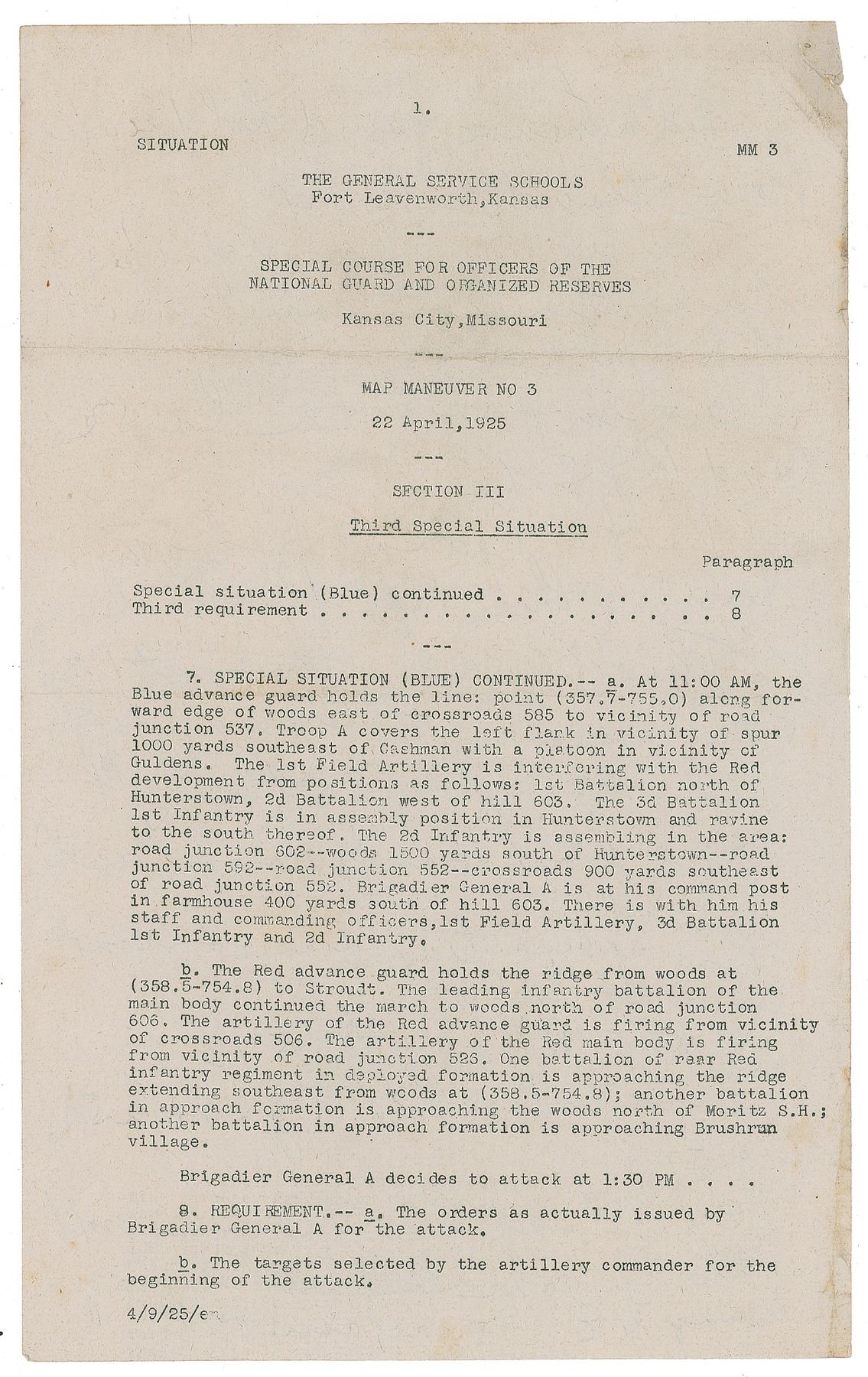 Two pages from the "Special Course for Officers of the National Guard and Organized Reserves" at Fort Leavenworth on April 22, 1925, both with notes lengthily written in pencil by Truman on the reverse. In part: "2nd Inf. on its right by flanking action to SE. 2nd Inf. will make the…attack. It will not secure Mortiz school house…Red advance guard hold ridge from Strand to Road. The leading element of infantry. Bu continues to march north of Rd."