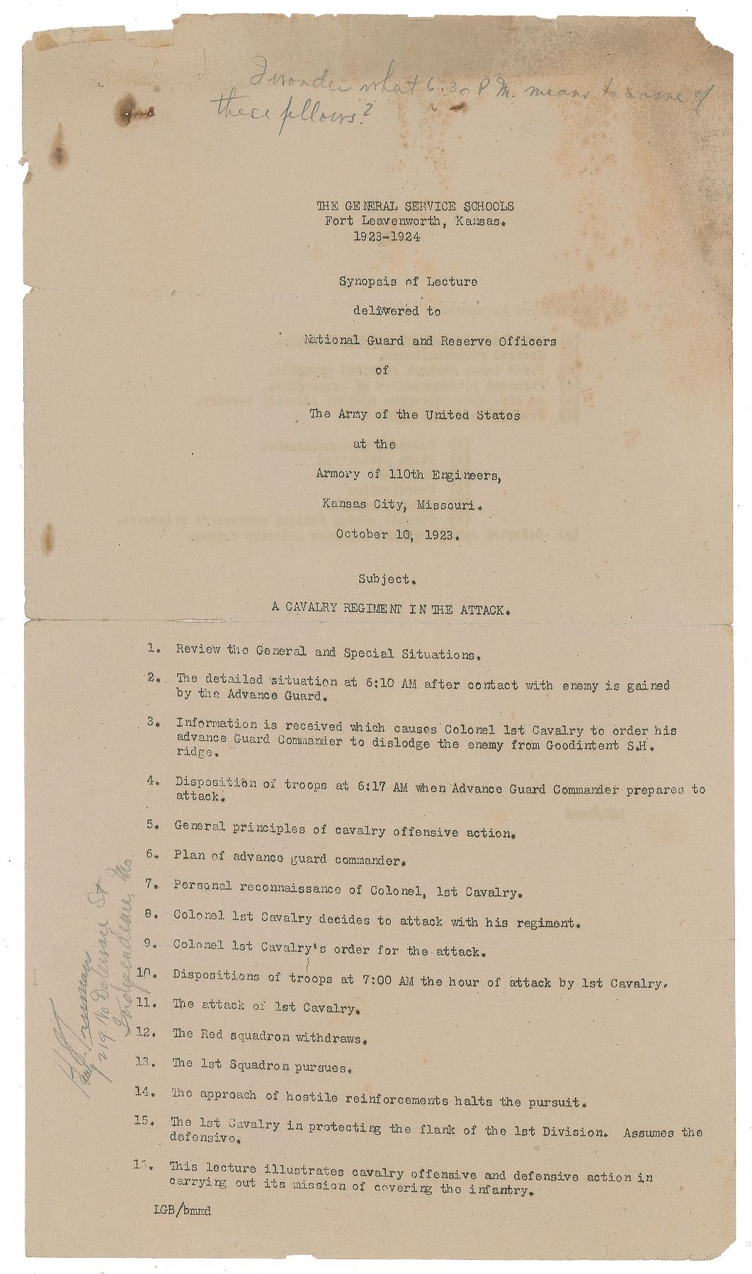 Last is a "Synopsis of Lecture delivered to National Guard and Reserve Officers of the Army of the United States at the Armory of 110th Engineers, Kansas City, Missouri, October 10, 1923," with "I wonder what 6:30 PM means to some of these fellows?" written at the top in pencil by Truman. In very good to fine condition, with some toning and creasing.