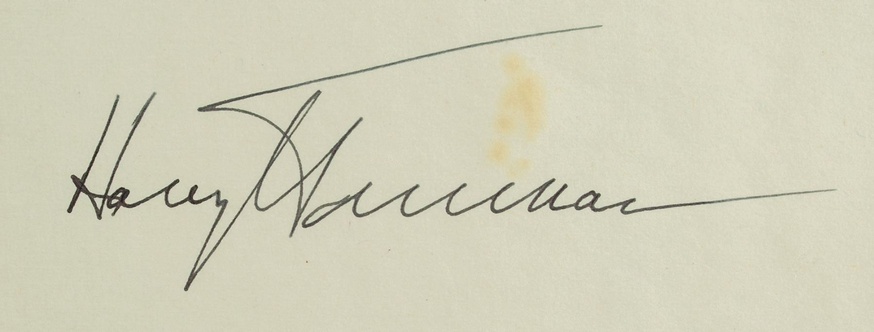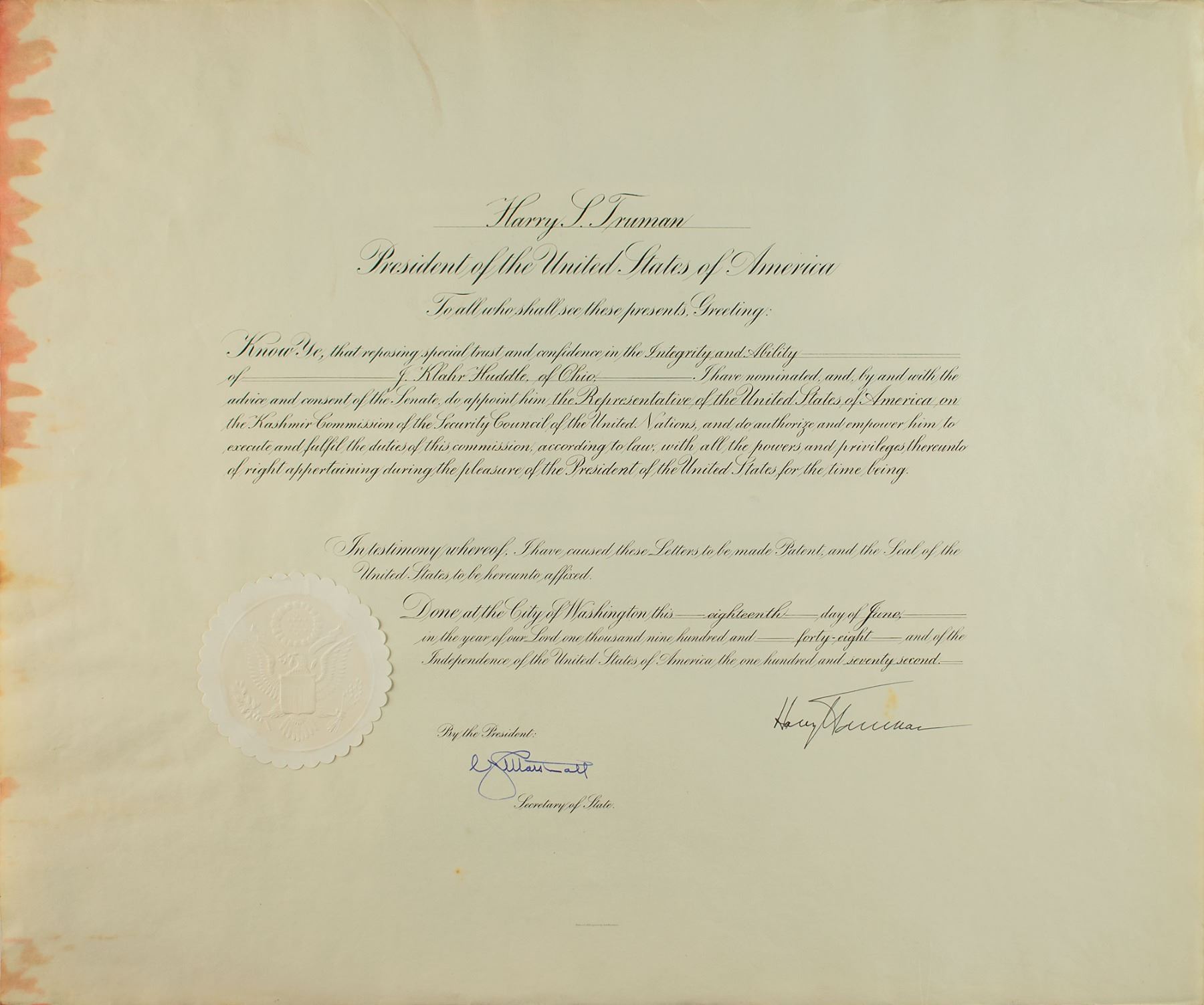 Partly-printed DS as president, one page, 23 x 19, June 18, 1948. President Truman appoints J. Klahr Huddle of Ohio as "the Representative of the United States of America on the Kashmir Commission of the Security Council of the United Nations." Signed at the conclusion by President Truman and countersigned by Secretary of State George C. Marshall. The white paper seal affixed to the lower left remains intact. In very good to fine condition, with rippling and staining to the left edge, and creasing to the upper right corner. At the time of this document, Jerome Klahr Huddle was also serving as the US Ambassador to Burma.
