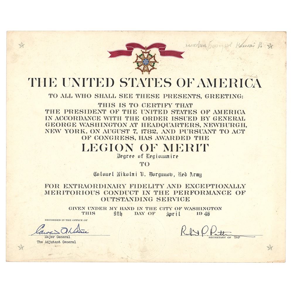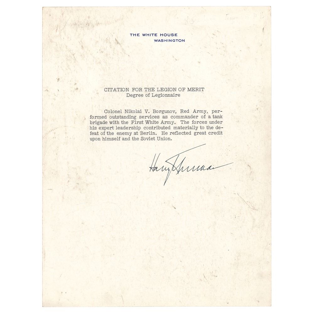 DS as president, one page, 8 x 10.5, White House letterhead, no date. President Truman awards the "Legion of Merit, Degree of Legionnaire," to a Soviet colonel following World War II. In full: "Colonel Nikolai V. Borgunov, Red Army, performed outstanding services as commander of a tank brigade with the First White Army. The forces under his expert leadership contributed materially to the defeat of the enemy at Berlin. He reflected great credit upon himself and the Soviet Union.” In very good to fine condition, with light soiling to both documents. Accompanied by the Legion of Merit certificate awarded to the general, bearing the autopen signature of Secretary of War Robert P. Patterson.