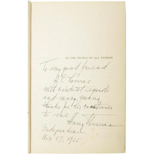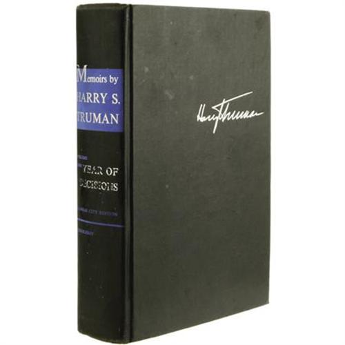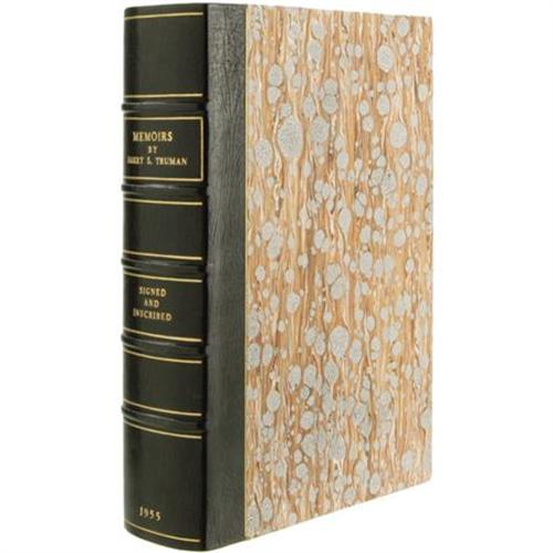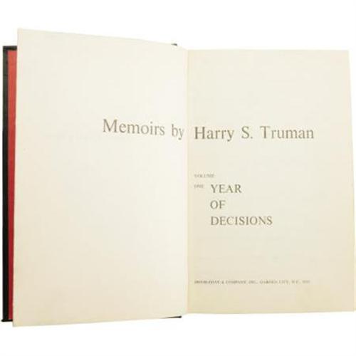 <B>Harry S. Truman: Inscribed and Signed Special Edition of <I>Memoirs by Harry S. Truman</B></I></B></I> <I>Volume One: Year of Decisions.</B></I> (Garden City, New York: Doubleday & Company, Inc., 1955), special Kansas City edition limited to 20,615 copies, 596 pages, black cloth with silver and blue lettering on the spine and front board, 8vo (5.5" x 8.5"), no dust jacket, clear plastic protective sleeve on boards, housed in a black quarter leather slipcase with marbled boards and gilt titles & five raised bands on the spine. Inscribed and signed "<I>To my good friend A. E. Loures with kindest regards and many, many thanks for his courtesies to me Harry Truman Independence Nov. 17, 1955</B></I>" on the dedication page. The book is in very good condition, with some minor edge wear and some fading to the spine titles. The text edges show small areas of staining, not affecting the inner text, which is itself a touch toned. The binding is excellent in this attractive first volume of Truman's memoirs, personally inscribed and signed by the man himself.<BR><BR><b>Shipping:</b> Books & Catalogs (<a target="_blank" href="http://www.heritageauctions.com/common/shipping.php">view shipping information</a>)