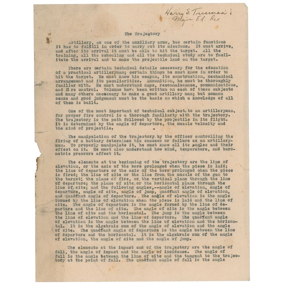 A two-page report entitled "The Trajectory," signed at the top of each page in ink, "Harry S. Truman, Major F. A. Res.," in part: "There are certain technical details necessary for the education of a practical artilleryman; certain things he must know in order to hit the target. He must know his weapon, its construction, mechanical arrangement and its peculiarities. Ammunition, he must be thoroughly familiar with. He must understand maps, reconnaissance, communications, and fire control…One of the most important technical subjects to an artilleryman, for proper fire control is a thorough familiarity with the trajectory. The trajectory is the path followed by the projectile in its flight." He goes on to discuss the technical aspects of the trajectory of ammunition.