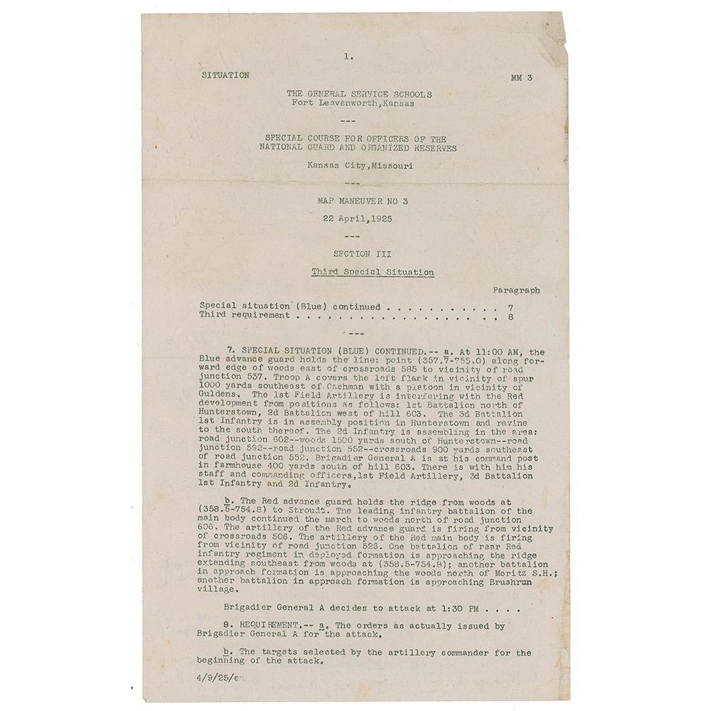 Two pages from the "Special Course for Officers of the National Guard and Organized Reserves" at Fort Leavenworth on April 22, 1925, both with notes lengthily written in pencil by Truman on the reverse. In part: "2nd Inf. on its right by flanking action to SE. 2nd Inf. will make the…attack. It will not secure Mortiz school house…Red advance guard hold ridge from Strand to Road. The leading element of infantry. Bu continues to march north of Rd."