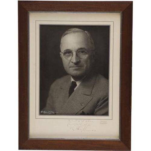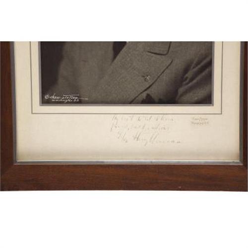 <B>Harry S. Truman Photograph Inscribed and Signed on Mat, May 8, 1945-his 61st birthday and V-E Day</B></I> Original 10” x 13” black-and-white portrait mounted in a 13” x 18” matte inscribed in full: <I>“My best to Ed McKim, friend, buddy, advisor, Harry Truman 5/8/45” </B></I>Ed McKim, who served as a sergeant in the field artillery battery commanded by Captain Harry Truman during World War I, later served briefly as an advisor to the President. The item, signed on the day “Victory in Europe” was celebrated (just a few weeks after Truman took office following the death of FDR), has been framed to 16.75” x 21”. The photograph, matte and frame are in fine condition; the inscription and signature have faded considerably but are still legible.<BR><BR><BR><b>Shipping:</b> Framed - with Glass, Medium (<a target="_blank" href="http://www.heritageauctions.com/common/shipping.php">view shipping information</a>)