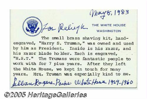 <B>Harry S. Truman Razor Set</B></I> This small brass shaving kit is hand-engraved, "Harry S. Truman," and was owned and used by Truman as President. Inside is his razor and razor blade holder, each engraved "H. S. T.," Lillian Rogers Parks obtained this rare piece of personal effects while serving the First Family. Parks served as a White House maid for thirty years from the days of Herbert Hoover through Dwight David Eisenhower. She later wrote a book about her thirty years of White House service, entitled <I>My Thirty Years Backstairs at the White House,</B></I> which recounted the many Presidential families that she served. A signed, engraved, White House card with the history of the shaving set as well as her related memories is included. Lot:254