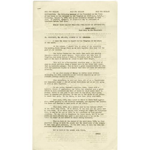 <B>Harry S Truman Signed 1952 State of the Union Address</B></I> Mimeographed Speech Signed: <I>"Harry S Truman/Best of luck to the twins!/Feb. 3, 1954"</B></I> at conclusion, 9p (front & verso), 8" x 14". The White House, January 9, 1952. Headed, in part: "HOLD FOR RELEASE/CONFIDENTIAL: The following message of the President on the State of the Union is for delivery to the Congress at 12:30 p.m., E.S.T., Wednesday, January 9, 1952, and is for automatic release at that time...." In part: <I>"In Korea, the forces of the United Nations turned hack the Chinese Communist invasion-and did it without widening the area of conflict. The action of the United Nations in Korea has been a powerful deterrent to a third world war. However, the situation in Korea remains very hazardous. The outcome of the armistice negotiation is still uncertain...At the present session of the United Nations in Paris, we, together with the British and the French, offered a plan to reduce and control all armaments under a foolproof inspection system. This is a concrete, practical proposal for disarmament. But what happened ? Vishinsky laughed at it. Listen to what he said: 'I could hardly sleep at all last night .... I could not sleep because I kept laughing." The world will be a long time forgetting the spectacle of that fellow laughing at disarmament. Disarmament is not a joke. Vishinsky's laughter met with shock and anger from people all over the world. And, as a result, Mr. Stalin's representative received orders to stop laughing and start talking...The thing that is uppermost in the minds of all of us is the situation in Korea. We must--and we will--keep up the fight there until we get the kind of armistice that will put an end to the aggression and protect the safety of our forces and the security of the Republic of Korea. Beyond that, we shall continue to work for a settlement in Korea that upholds the principles of the United Nations. We went into Korea because we knew that Communist aggression had to be met firmly if freedom was to be preserved in the world. We went into the fight to save the Republic of Korea, a free country, established under the United Nations. These are our aims. We will not give up until we attain them. Meanwhile, we must continue to strengthen the forces of freedom throughout the world. I hope the Senate will take early and favorable action on the Japanese peace treaty, on our security pacts with the Pacific countries, and on the agreement to bring Greece and Turkey into the North Atlantic Treaty. We are also negotiating an agreement with the German Federal Republic under which it can play an honorable and equal part among nations and take its place in the defense of Western Europe...I am glad to hear that home rule for the District of Columbia will be the first item of business before the Senate. I hope that it, as well as statehood for Hawaii and Alaska, will be adopted promptly...In all we do, we should remember who we are and what we stand for. We are Americans. Our forefathers had far greater obstacles than we have, and much poorer chances of success. They did not lose heart, or turn aside from their goals. In that darkest of all winters in American history, at Valley Forge, George Washington said: 'We must not, in so great a contest, expect to meet with nothing but sunshine." With that spirit they won their fight for freedom. We must have that same faith and vision...."</B></I> Stapled at top left corner. Folds, else in fine condition. From the Henry E. Luhrs Collection. Accompanied by LOA from PSA/DNA.