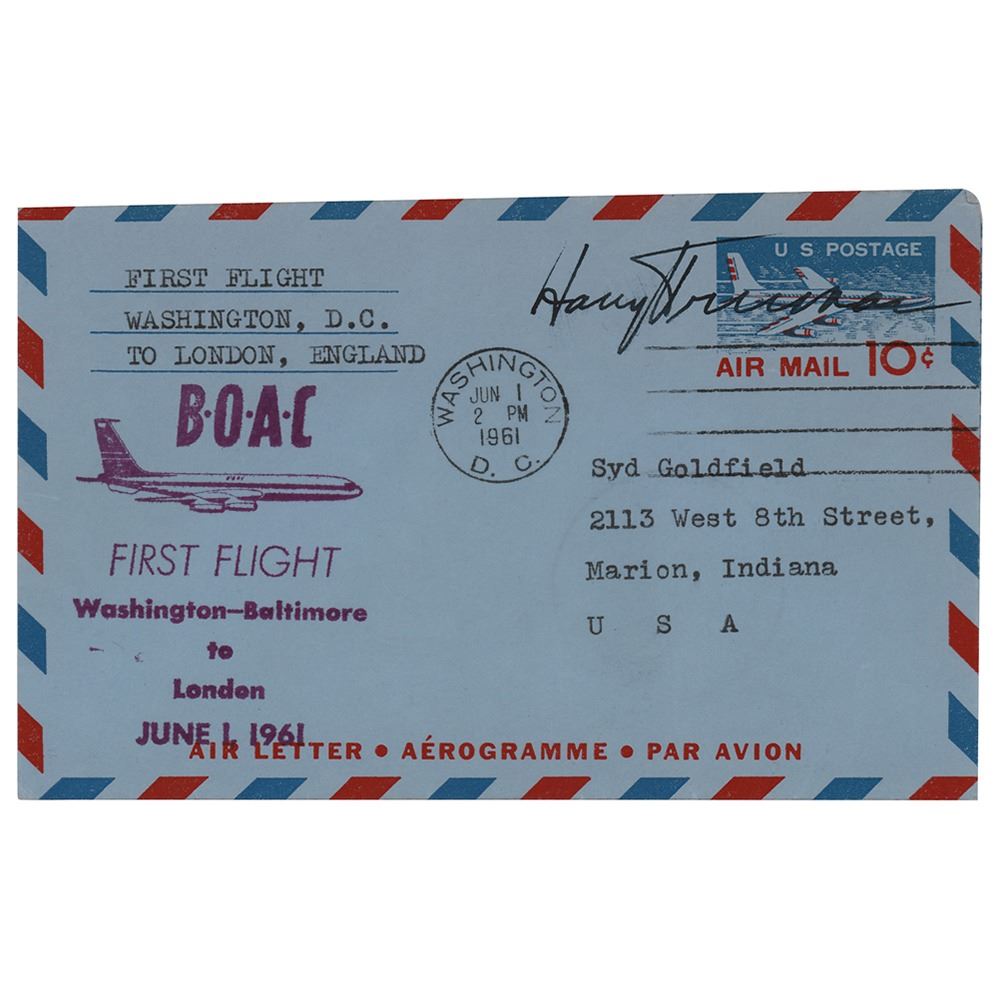 Air mail envelope carried aboard the BOAC first flight from Washington-Baltimore to London, on June 1, 1961, 5.75 x 3.5, signed in the upper right corner in black ink by Harry S. Truman. In fine condition.