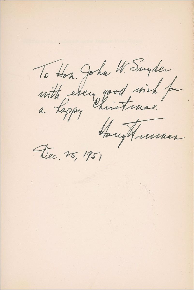 Limited edition of Truman’s Address at the Conference on the Japanese Peace Treaty, which he delivered on September 4, 1951. Quarter leather-bound hardcover, 6.5 x 9.5, 12 pages, numbered 6/60. Signed and inscribed as president on the first free end page in black ink, “To Hon. John W. Snyder, with every good wish for a happy Christmas, Harry S. Truman, Dec 25, 1951.” In fine condition.