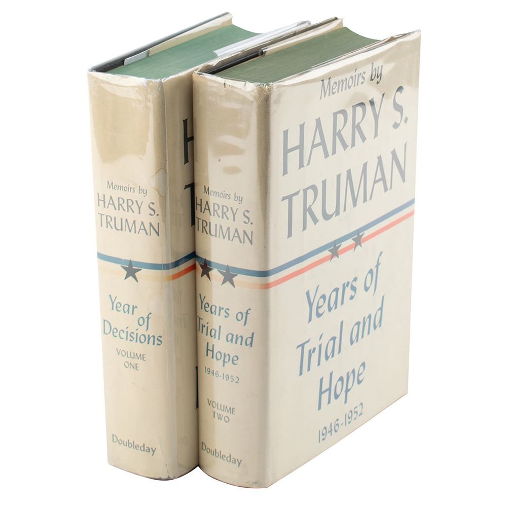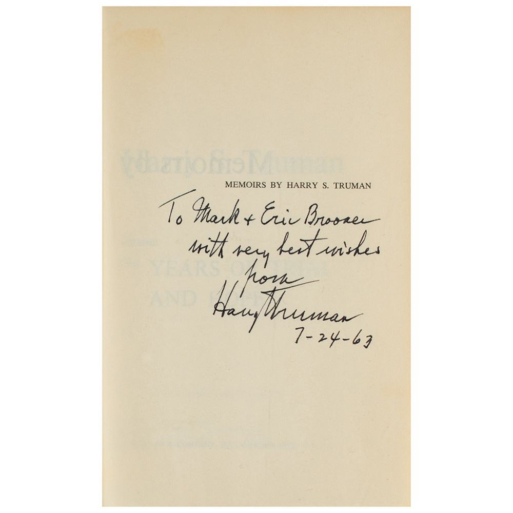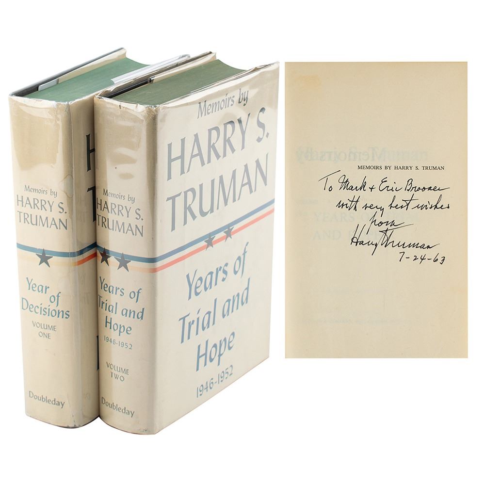Signed book: Years of Trial and Hope, 1946–1952. Later printing. NY: Doubleday, 1956. Hardcover with dust jacket, 6 x 8.5, 594 pages. Signed and inscribed on the half-title page in ink, "To Mark & Eric Brooner, with very best wishes, from Harry S. Truman, 7-24-63." Includes an unsigned later printing of the first volume. In very good to fine condition, with scuffing, staining, and tears to the dust jackets, and a bookplate affixed to the front pastedown of the signed volume.