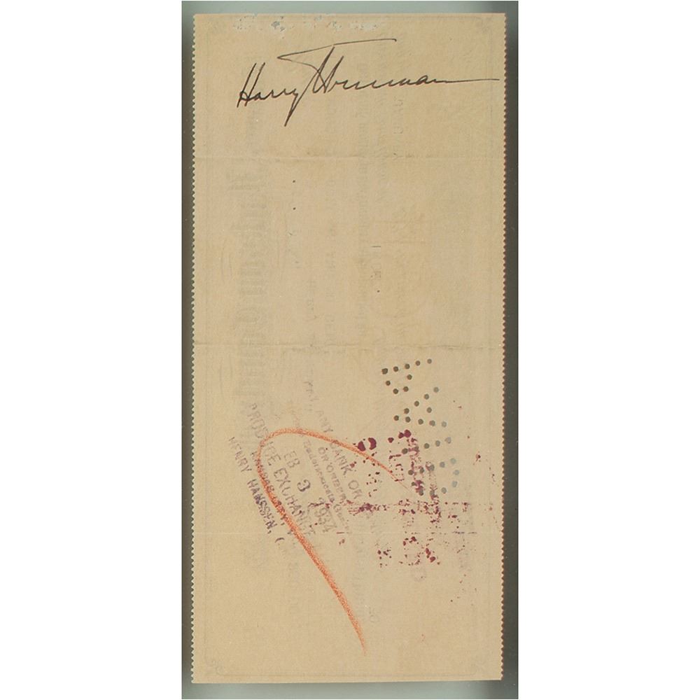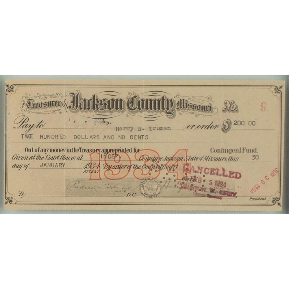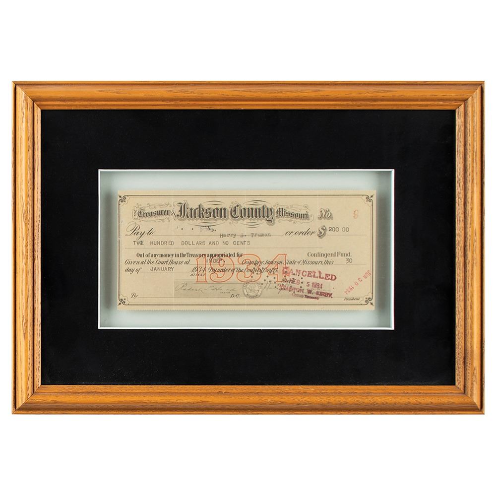 Jackson County Treasury check, 7.5 x 3.5, filled out in type and made payable to Harry S. Truman for $200, January 30, 1934, endorsed on the reverse in fountain pen, "Harry S. Truman." The front bears pre-printed signatures of Truman and a clerk. Matted and framed with glass on both sides to an overall size of 13.75 x 9.75. In fine condition, with some tiny specks of paper loss to the left edge.