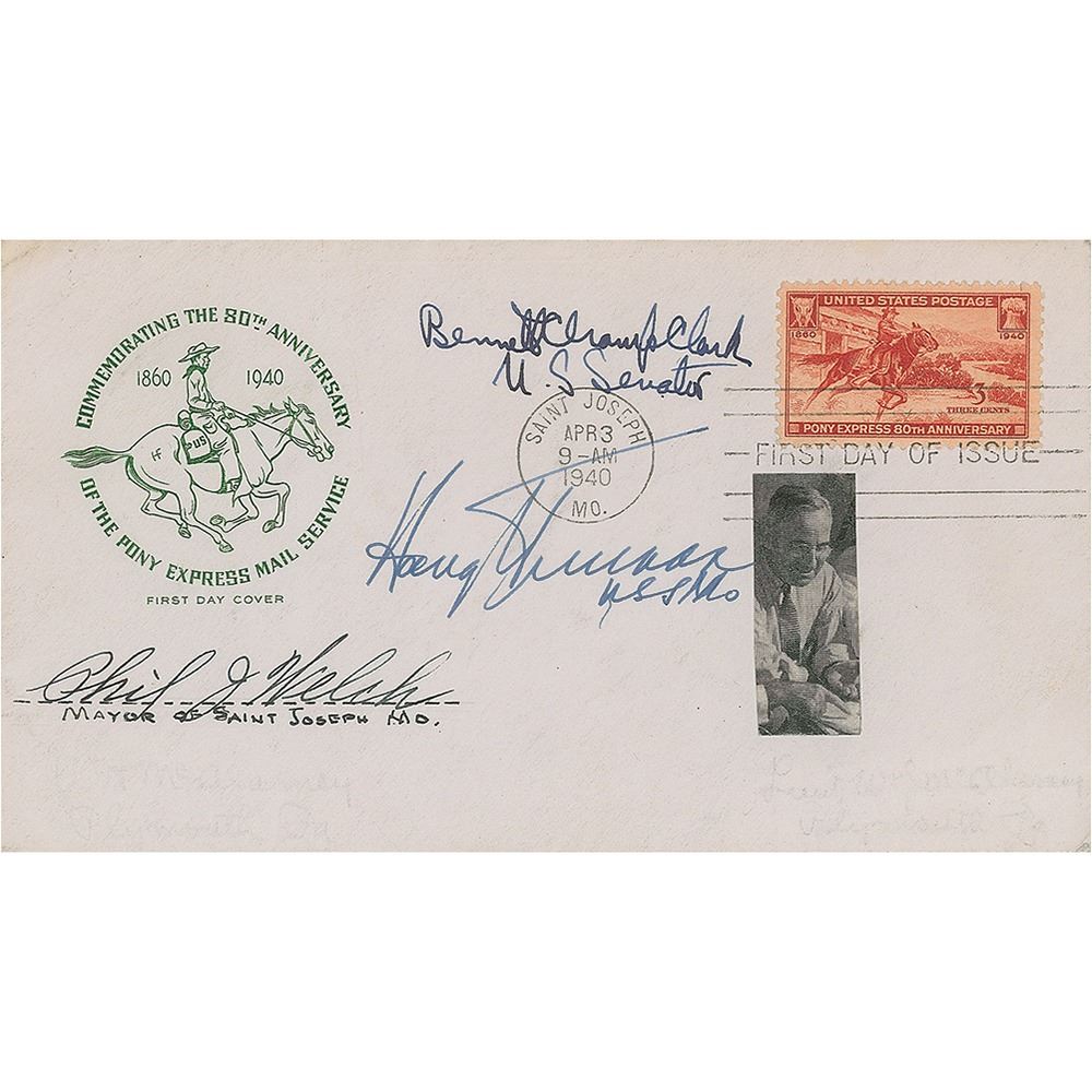 FDC with a cachet honoring the 80th anniversary of the Pony Express Mail Service, postmarked April 3, 1940, signed in fountain pen, "Harry S. Truman, U.S.S. Mo." The cover is also signed by Missouri Senator Bennett Champ Clark and Missouri Congressman Phil J. Welch. In fine condition.